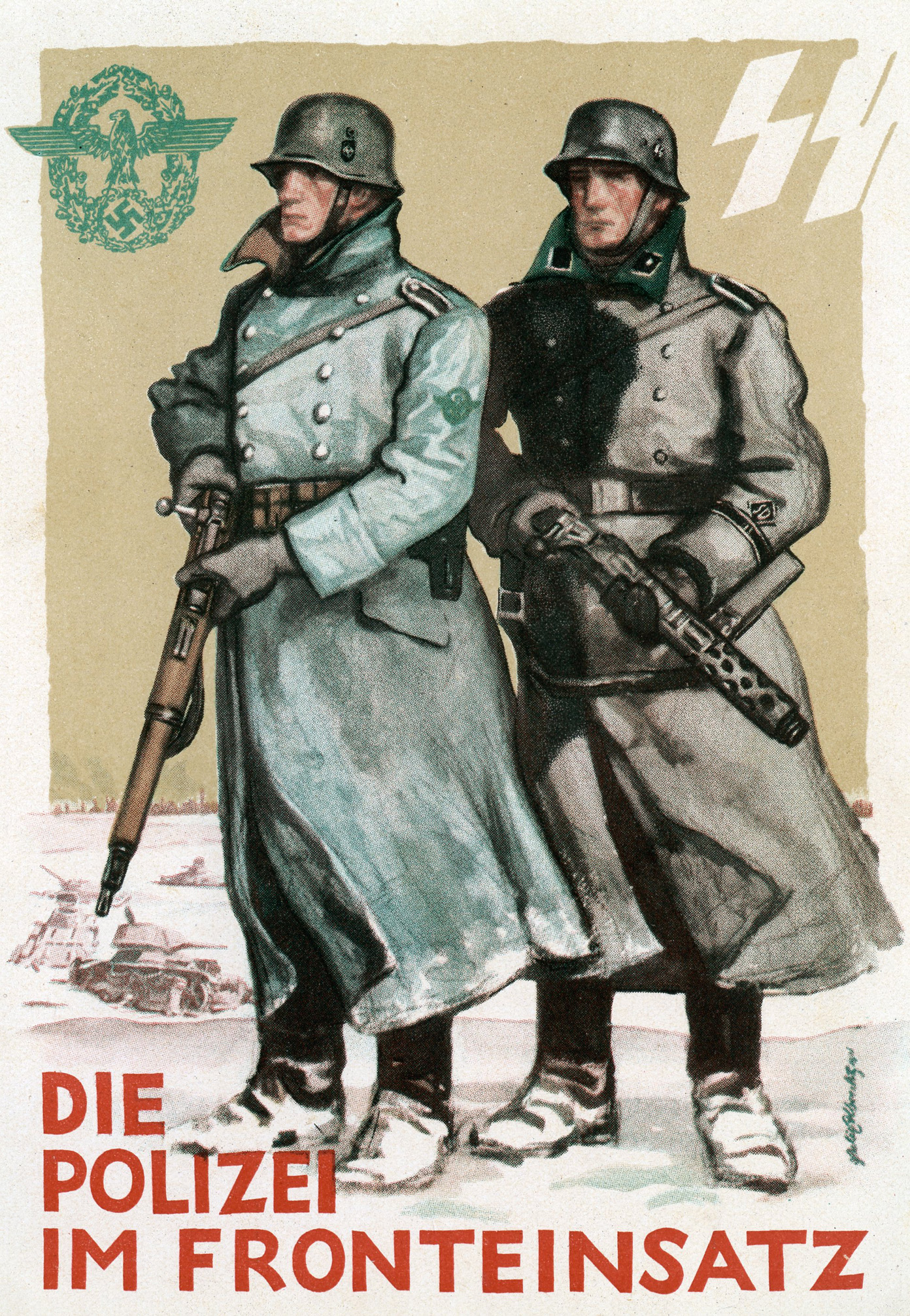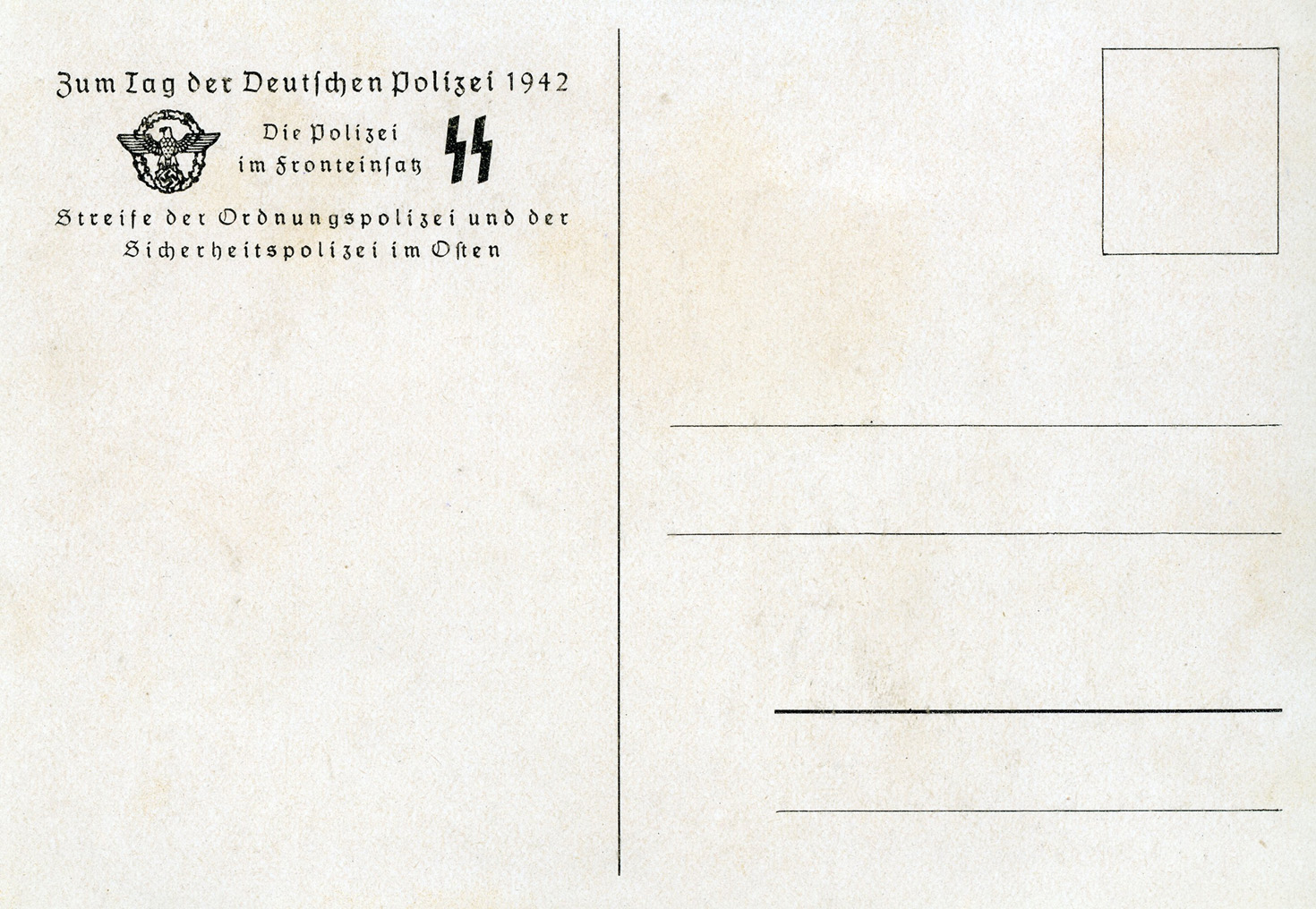 [Below: Okay, it's time for some flashy postcards. This one celebrates police on the front lines, which were under the control of the SS. Click to enlarge.]