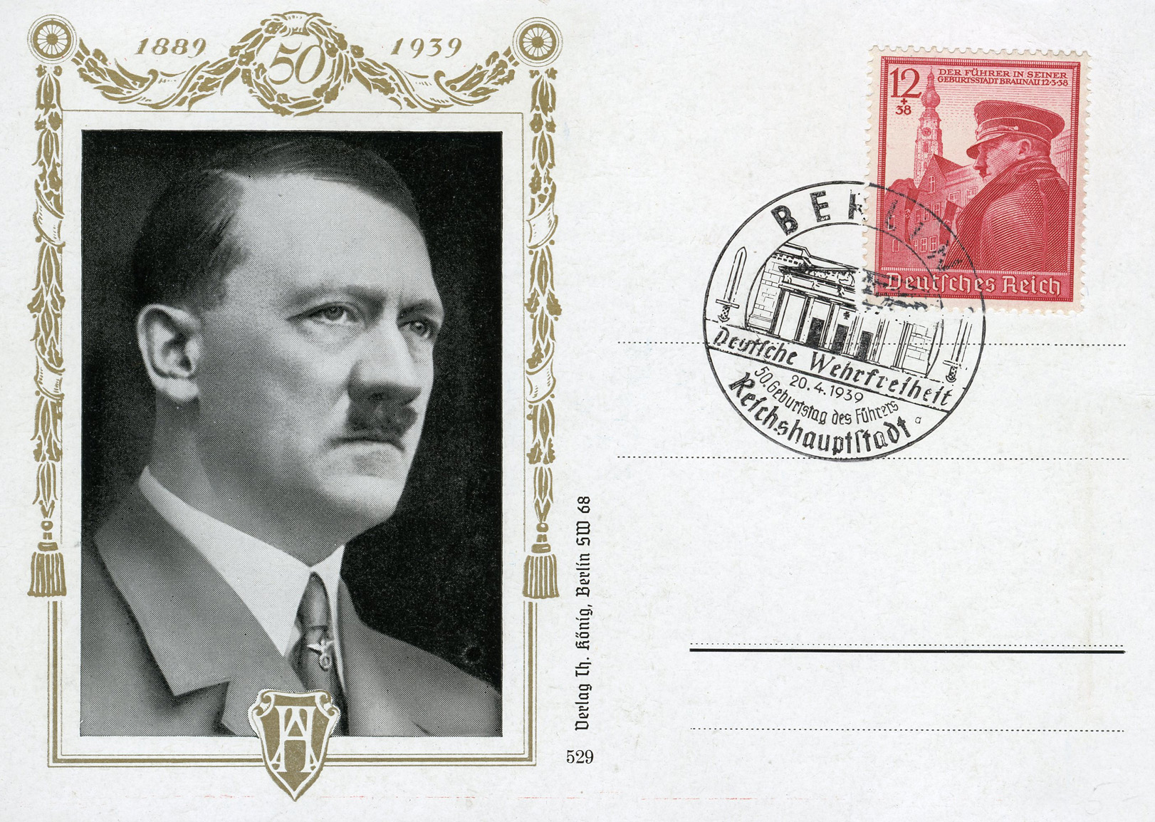[Below: This is a postcard celebrating the 50th birthday of Adolf Hitler. What a beautiful cancel... Click to enlarge.]
