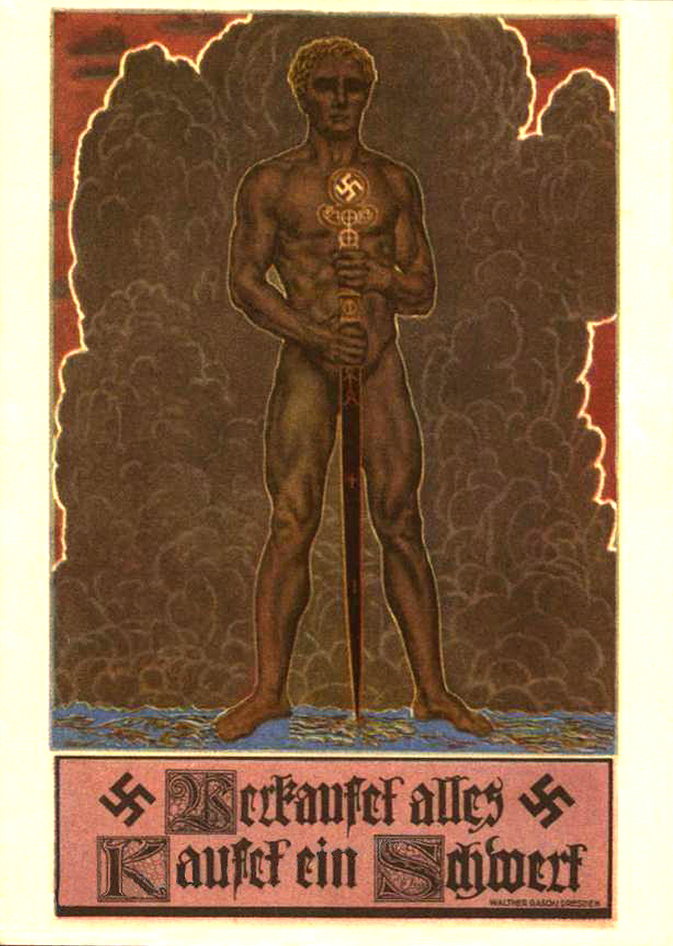 [Below: This is an extremely rare postcard. It sold for one Reich Mark which used for a donation to the NSDAP 1932 elections. It boldly proclaims 'Sell everything and buy a sword.' This phrase originates from the Gospel of Luke (22:36), where Jesus says "sell your cloak and buy a sword".]
