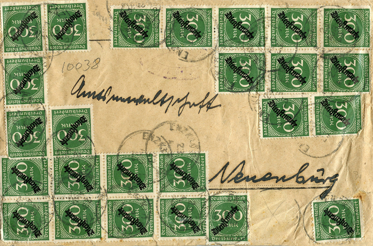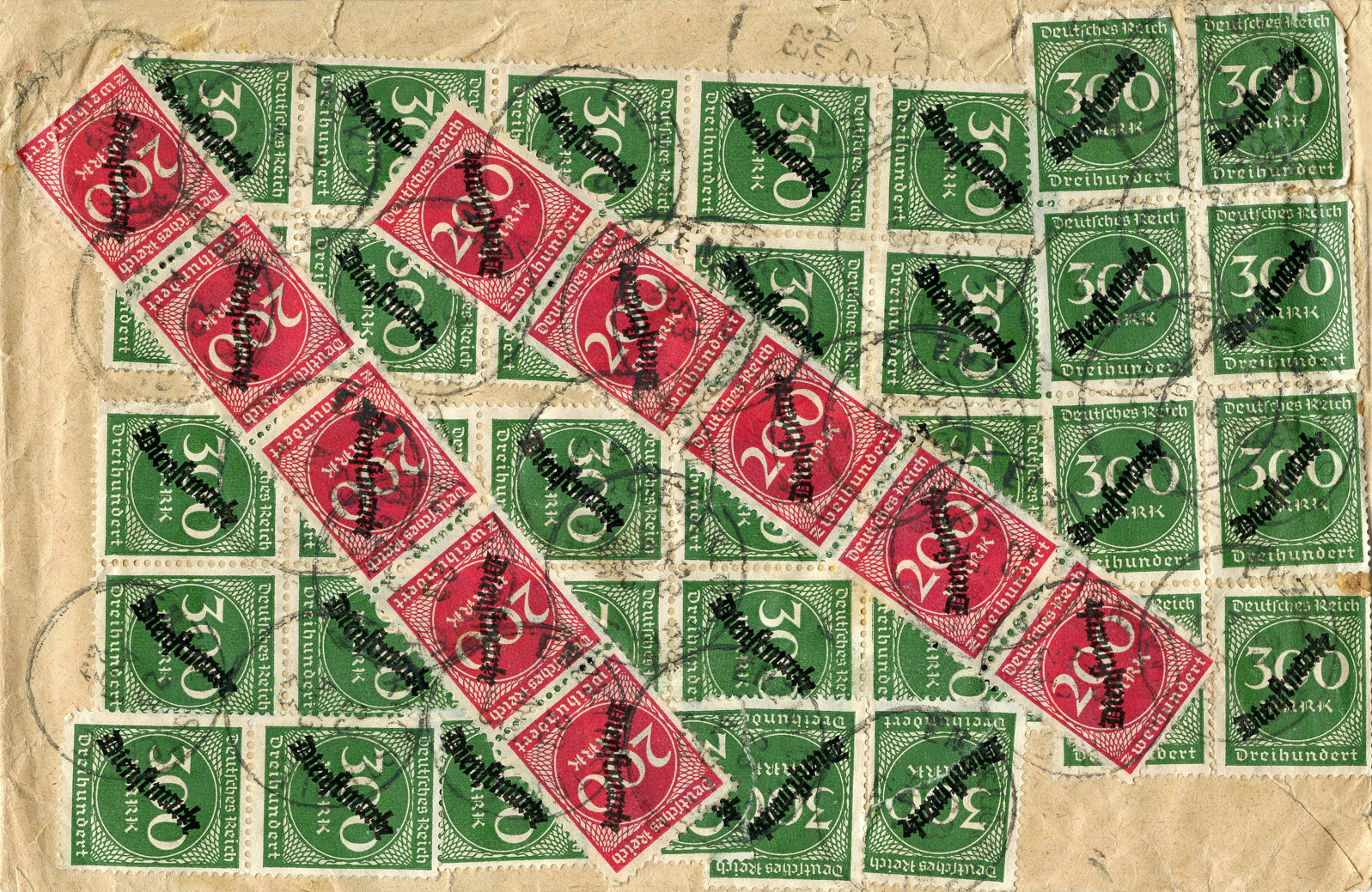 [Below: Here is an example of the insanity of the inflation in Germany in the 1920s. This uses official stamps issued in 1921. It was canceled on August 28, 1923 and uses every inch of the envelope and more for postage. Each stamp, overprinte 'Dienstmarke' (Service Mark), is only 300 marks, which is nothing compared to what was to come, with stamp prices being in the BILLIONS! Click to enlarge.]
