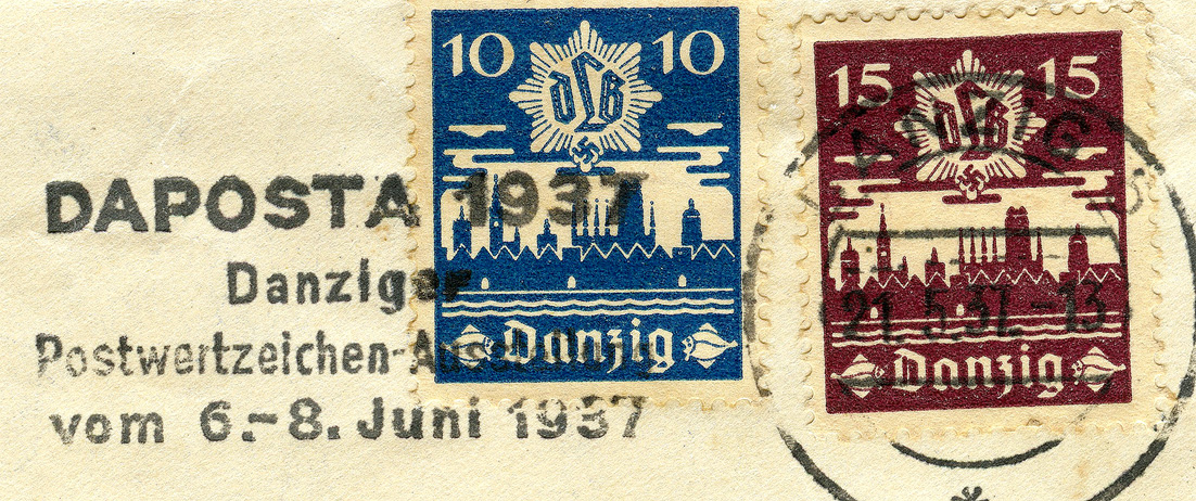 [Below: Close-up. The cancel says 'DAPOSTA 1937 - Danziger Postwertzeichen Ausstellung' (DAPOSTA 1937 - Danzig Postage Stamp Exhibition). The reverse is blank. Click to enlarge.]