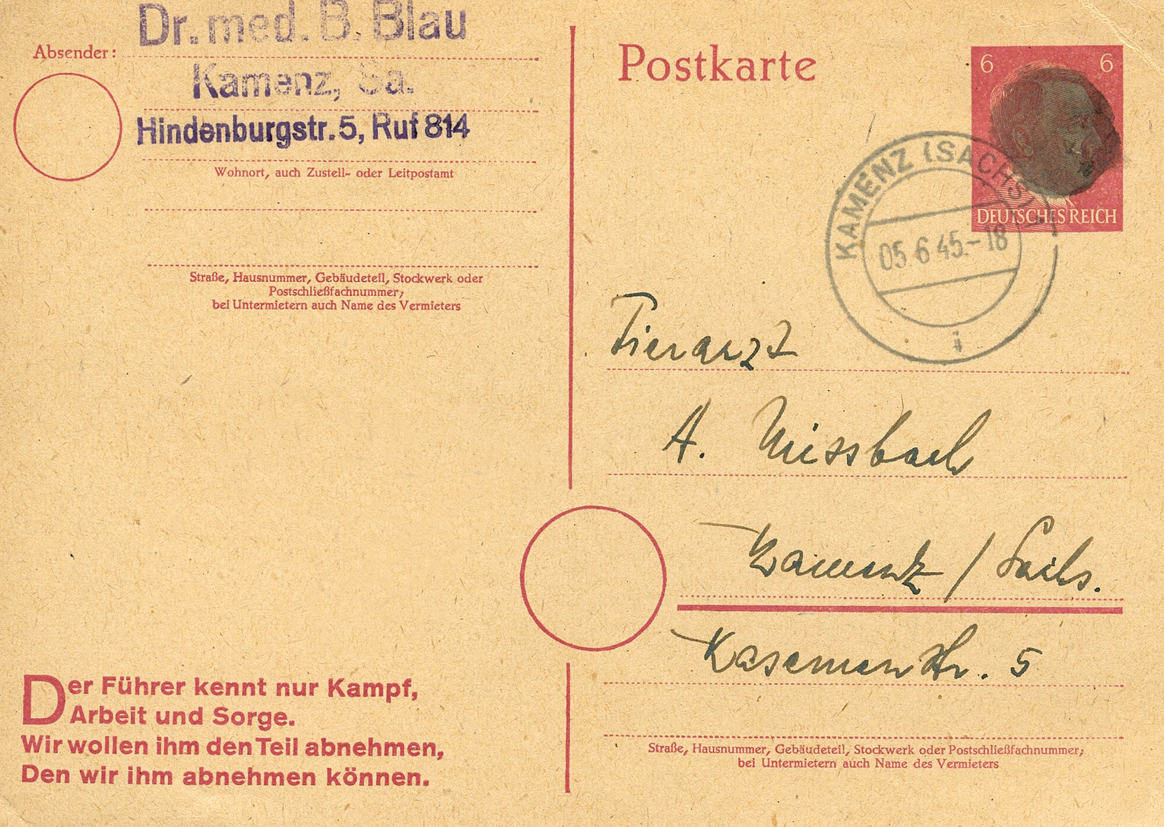 [Below: This handstamp Hitler blackout wasn't quite black enough so you can still see the forbidden face, and again they forgot to cover the quote. It was postmarked on June 5, 1945.]