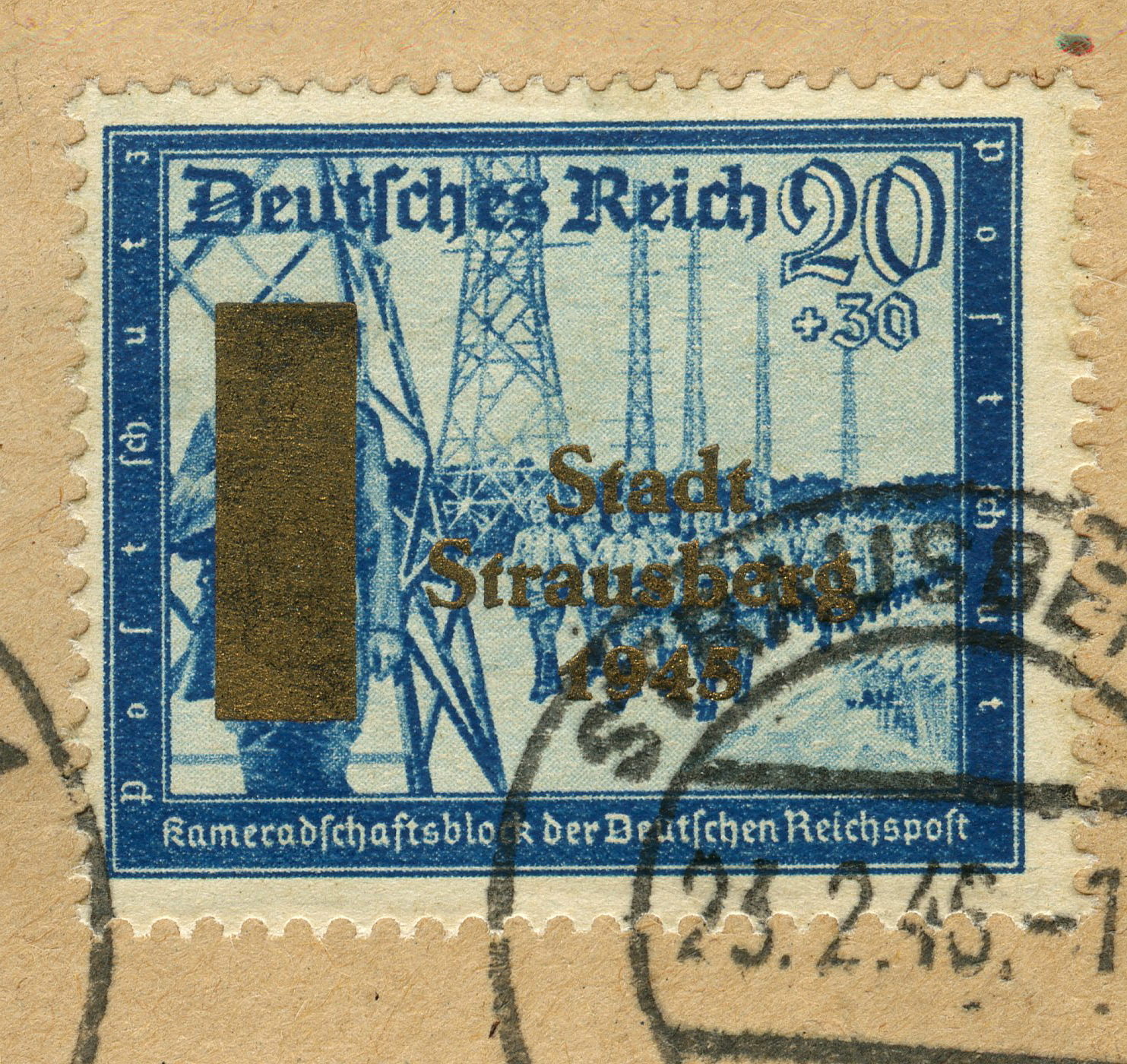 [Below: Hitler stamps weren't the only stamps the Allies tried to destroy, there were an array of verboten stamp designs. On the far right this has a postage stamp with a gold bar on it, which covers the image of a soldier. It was postmarked on February 23, 1946.]