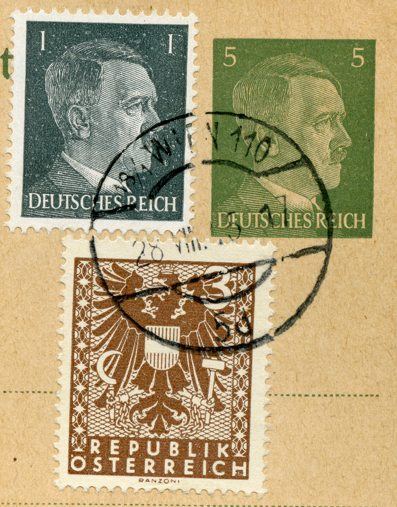 [Below: Sometimes Hitler stamps were snuck by the postal authorities, or in this case canceled but not sent. This shows an Allied occupation stamp (with a peculiar hammer and sickle design like that of communism). It was postmarked on August 28, 1945 in Vienna.]