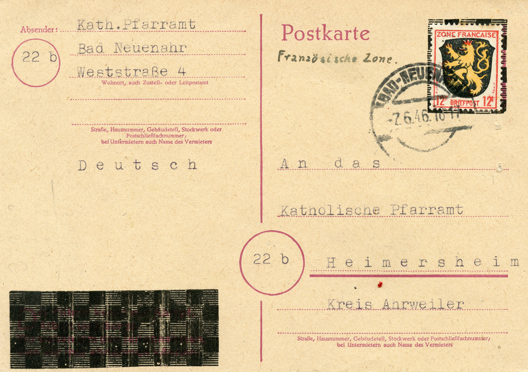 [Below: This is from the French zone of occupation and postmarked on June 7, 1947. It uses the same type of Hitler blackout as one above, but it places the postage stamp right over the Hitler head. The word 'Deutsch' is to let the censors know what language is written, a requirement for all mail sent out of Germany.]