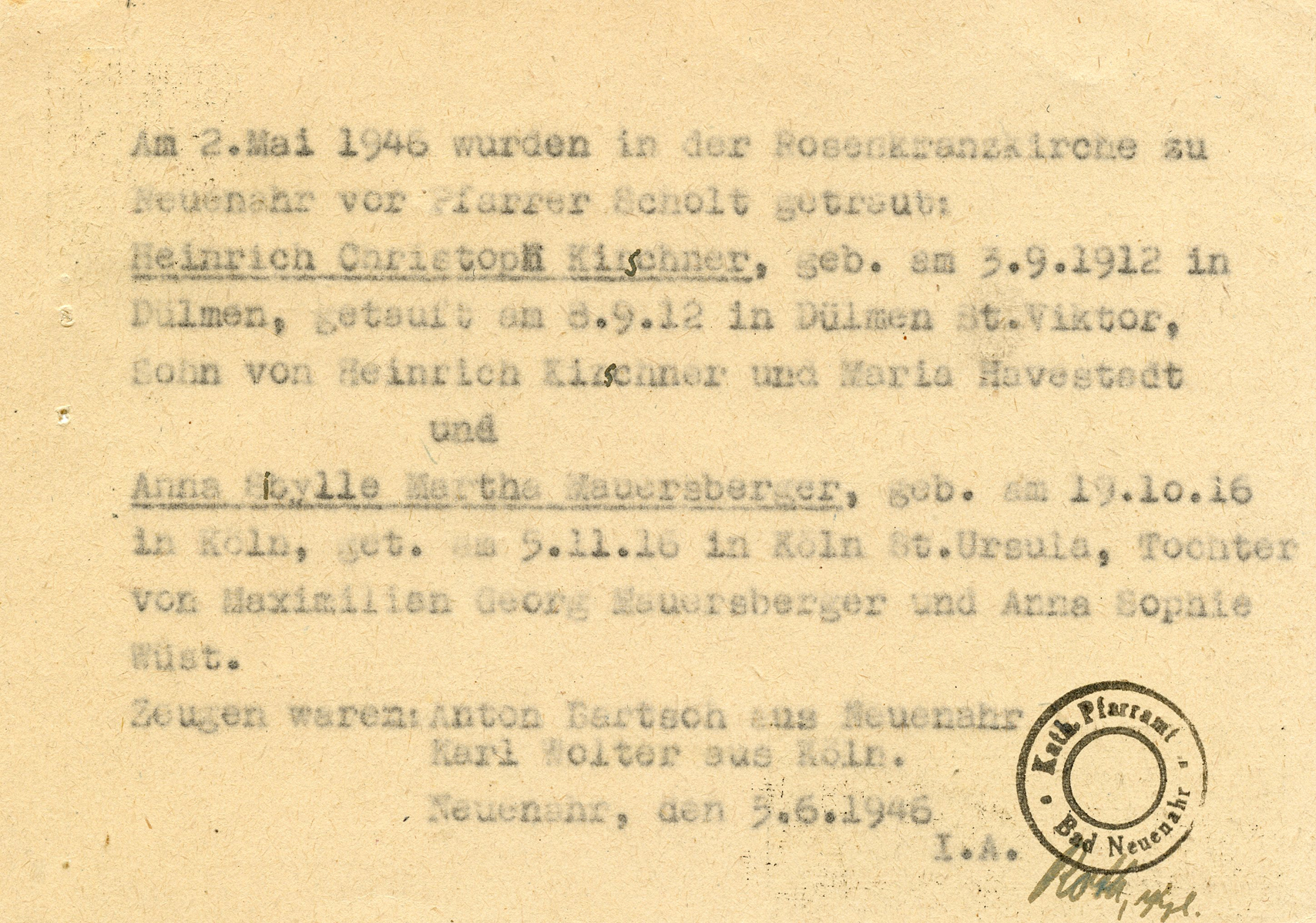 [Below: Reverse. This lists information on a marriage and a baptism sent from a Church.]