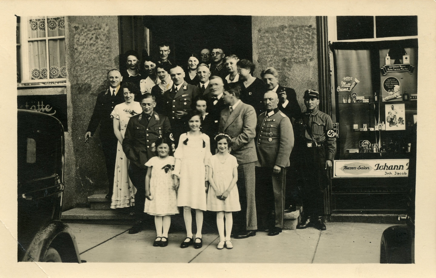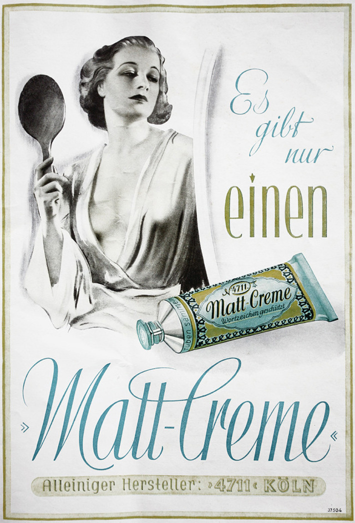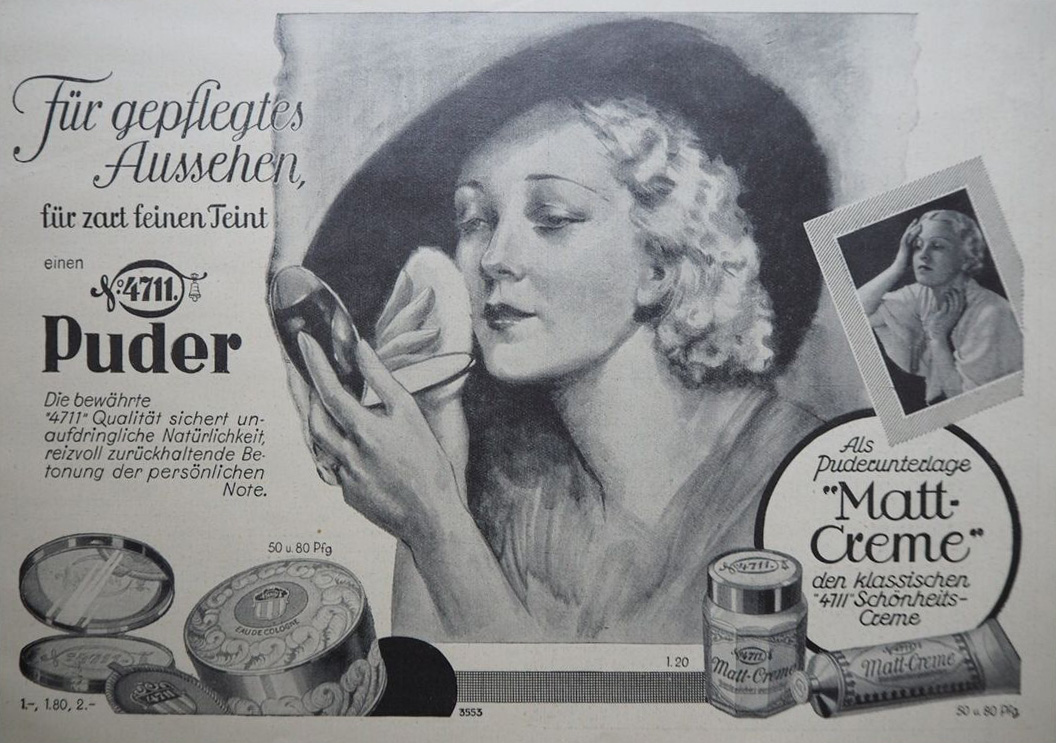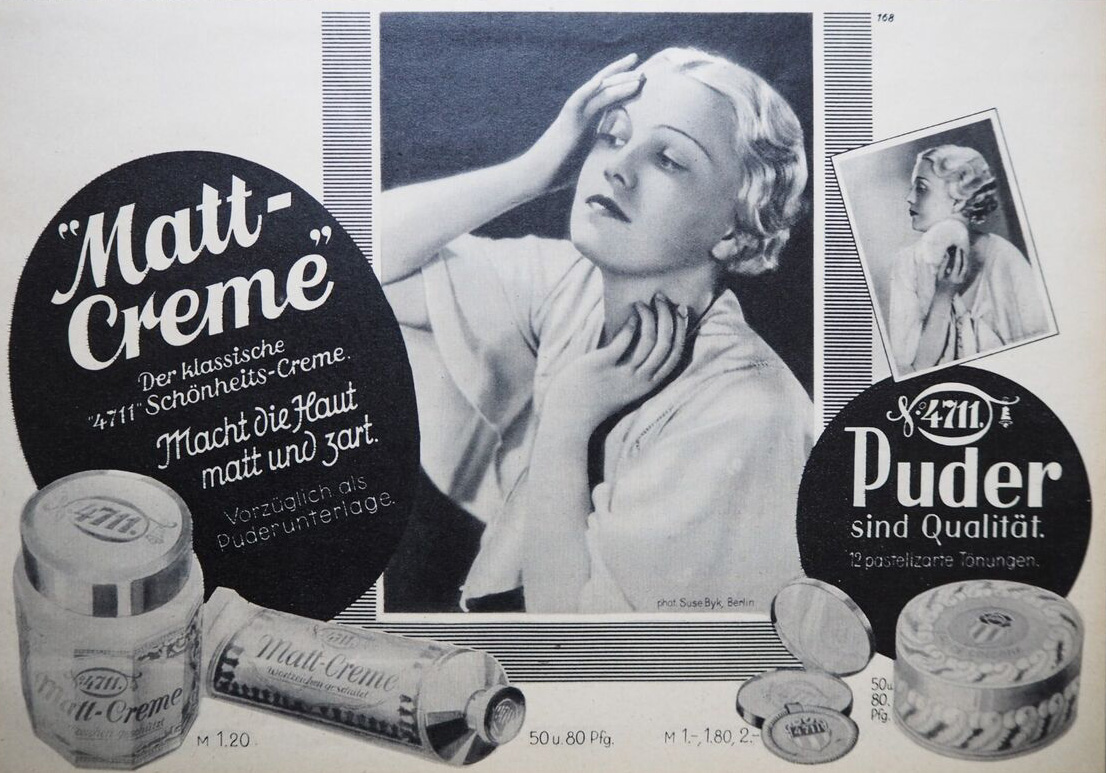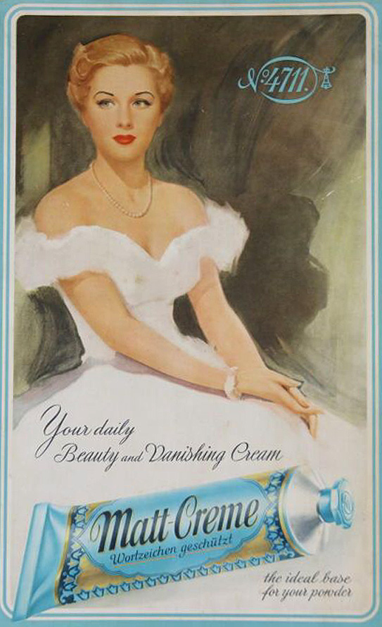 [Below: To the right of the group is a store window advertising 'Matt Creme' (matte cream), I was curious so I looked it up. It is a 'vanishing cream', used for 'Vanishing cream mainly acted as a moisturizer in a woman's beauty routine. Vanishing just meant that it 'vanished' or 'disappeared' after your skin absorbed it.' It also was used as a powder base. Some of these creams advertising was very racy!]