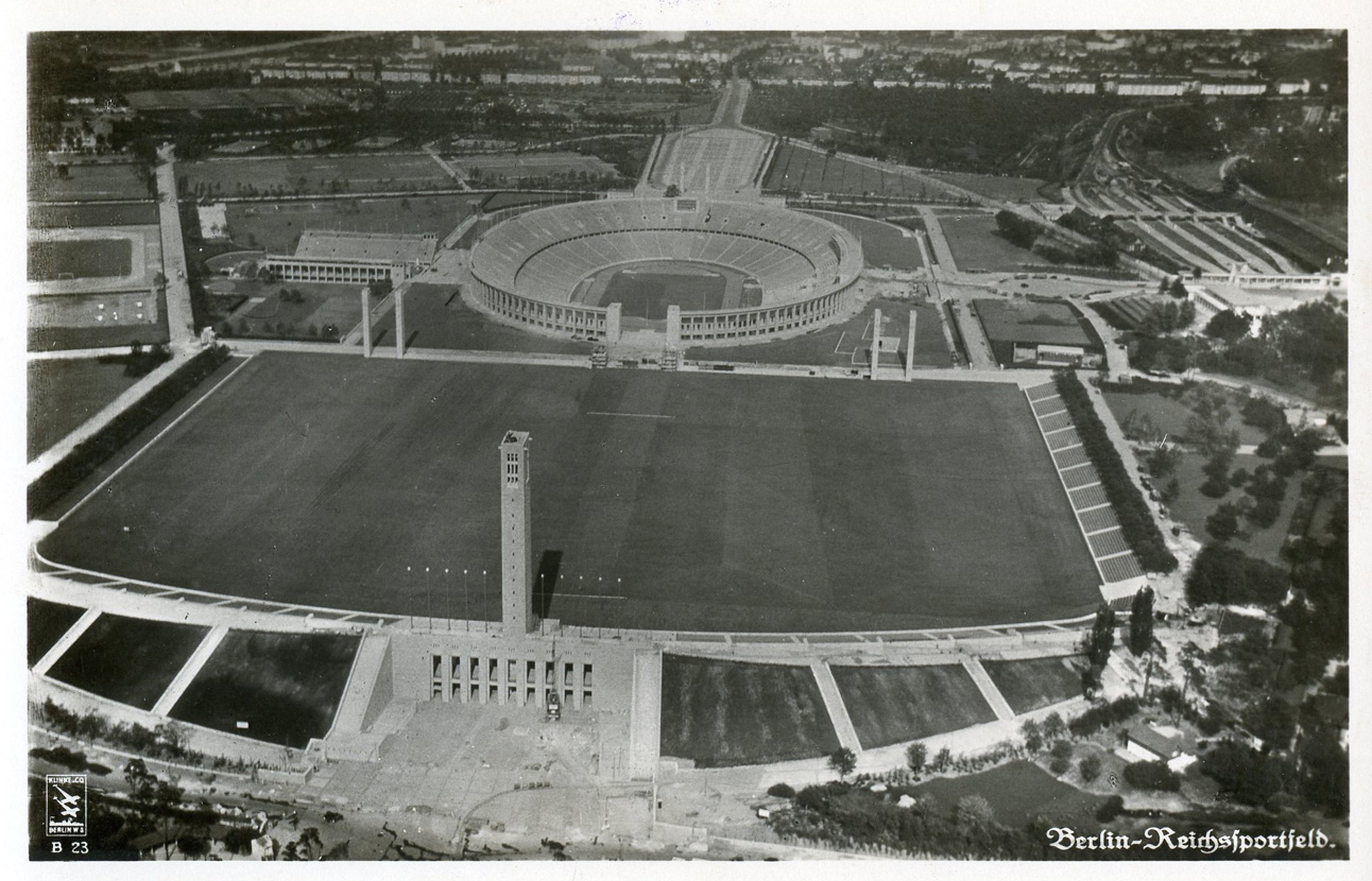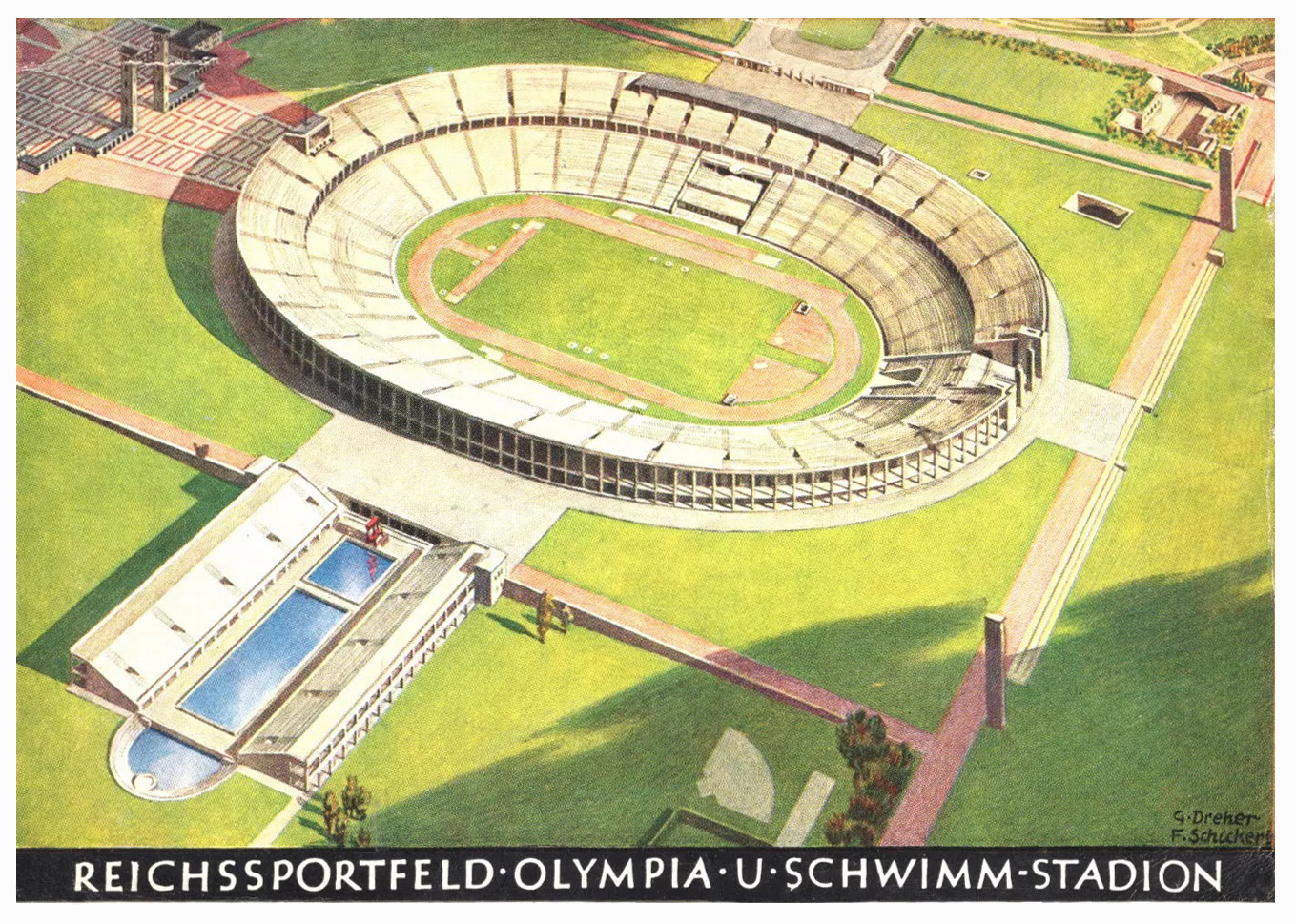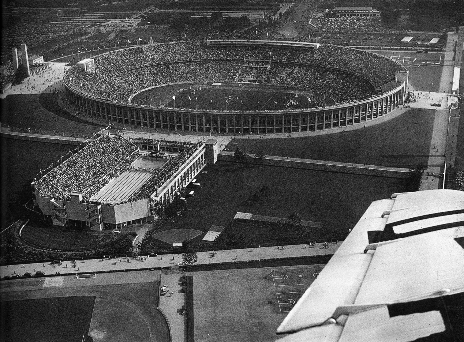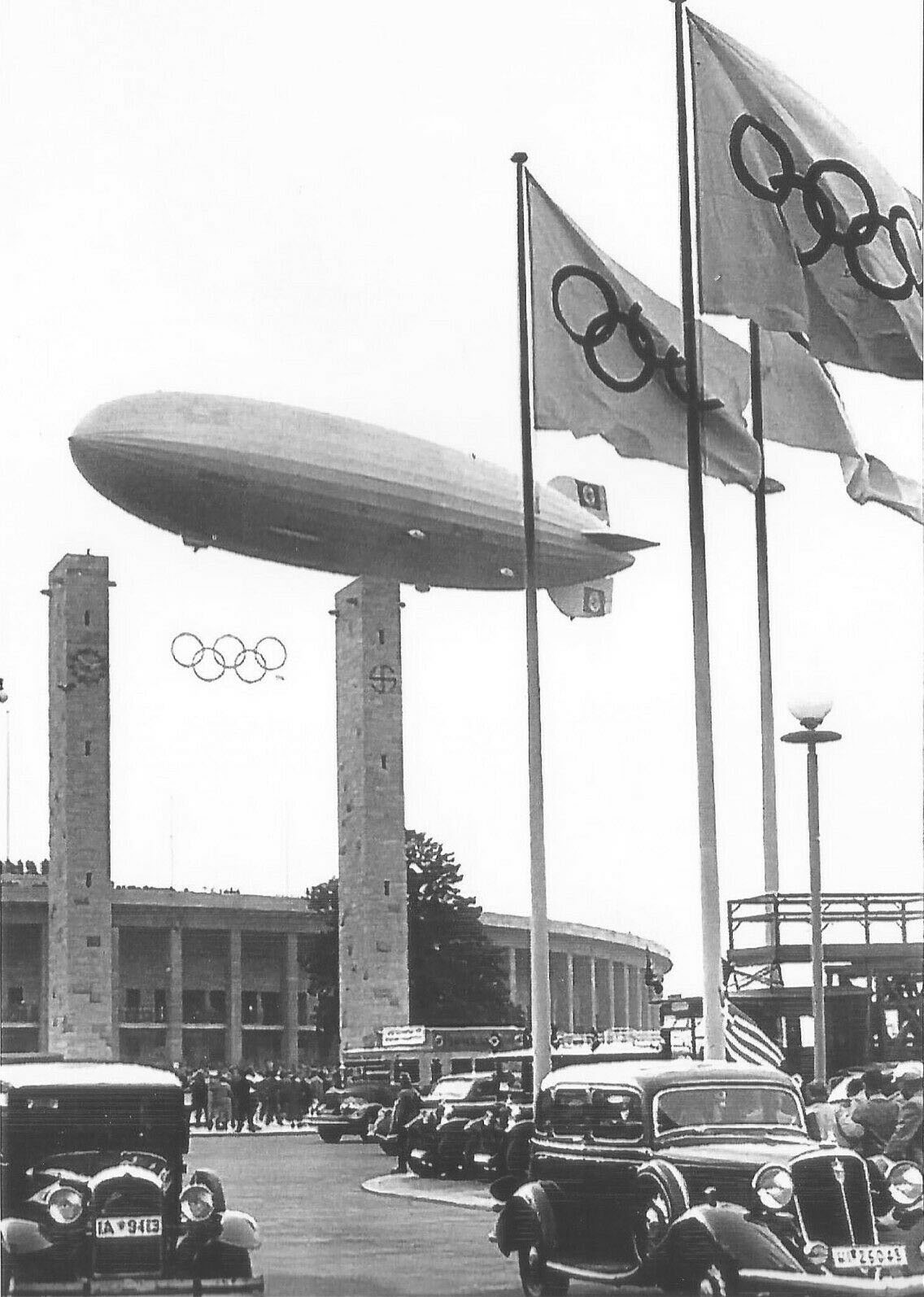 [Above: Olympic stadium with a Zeppelin overhead.]