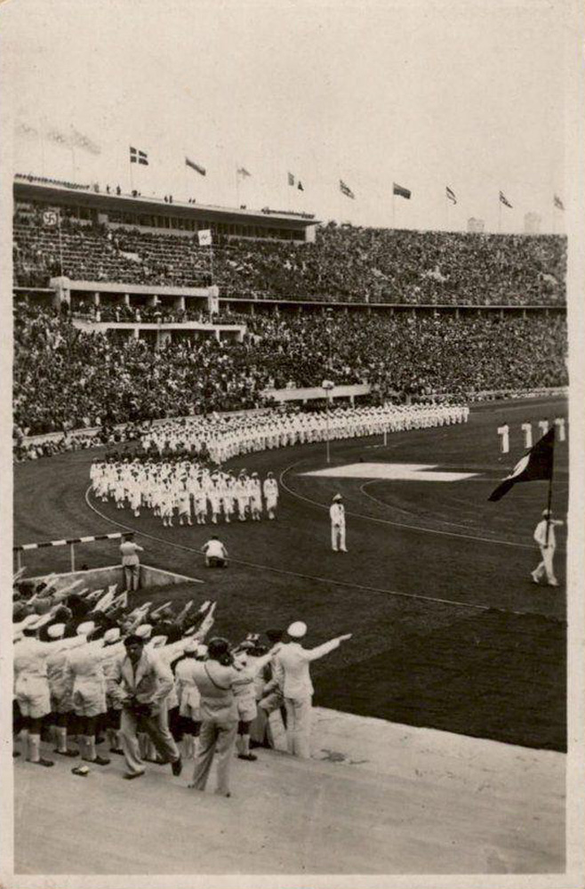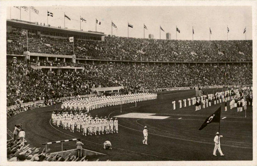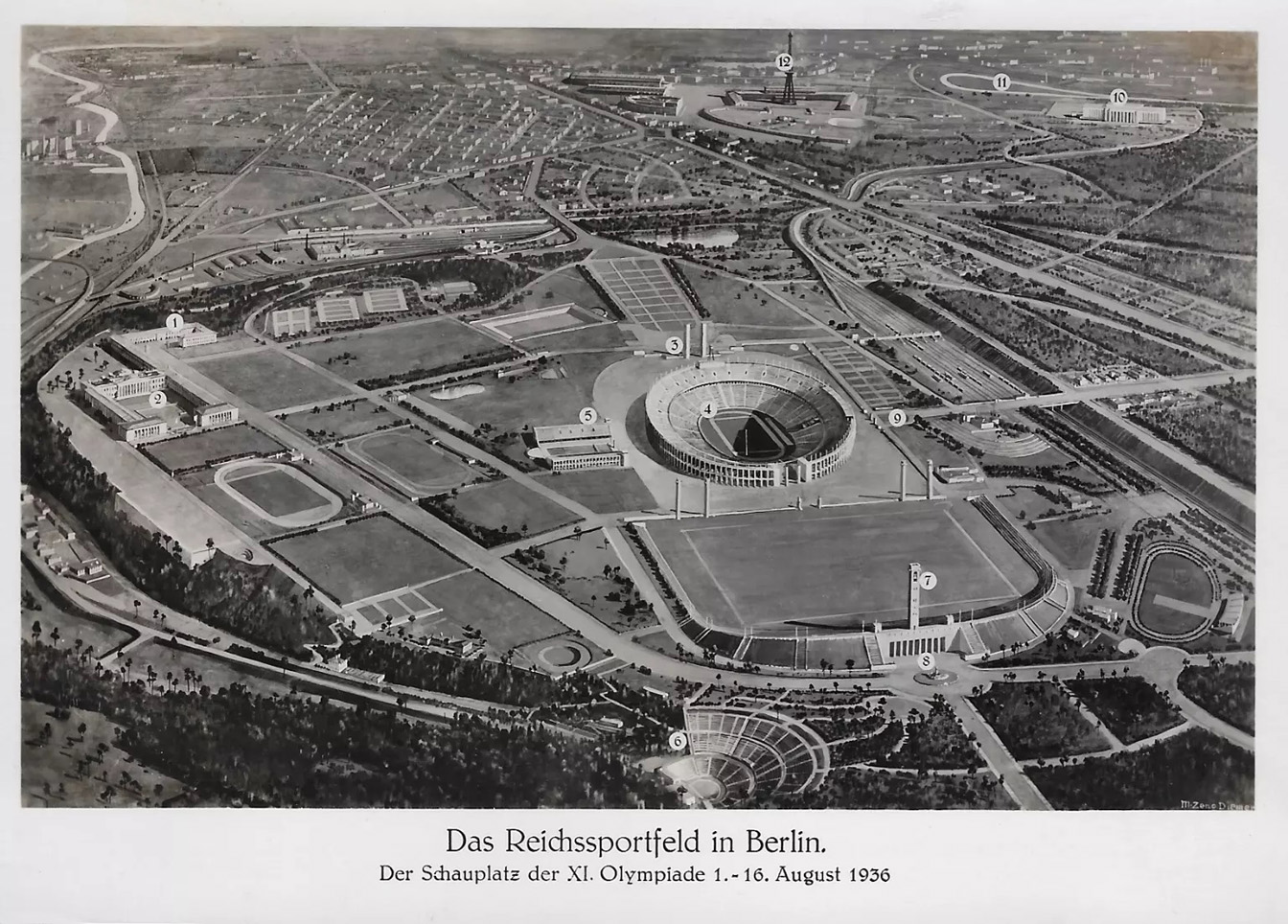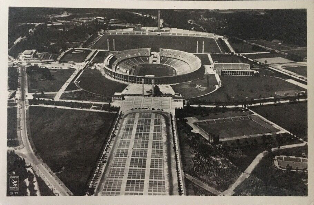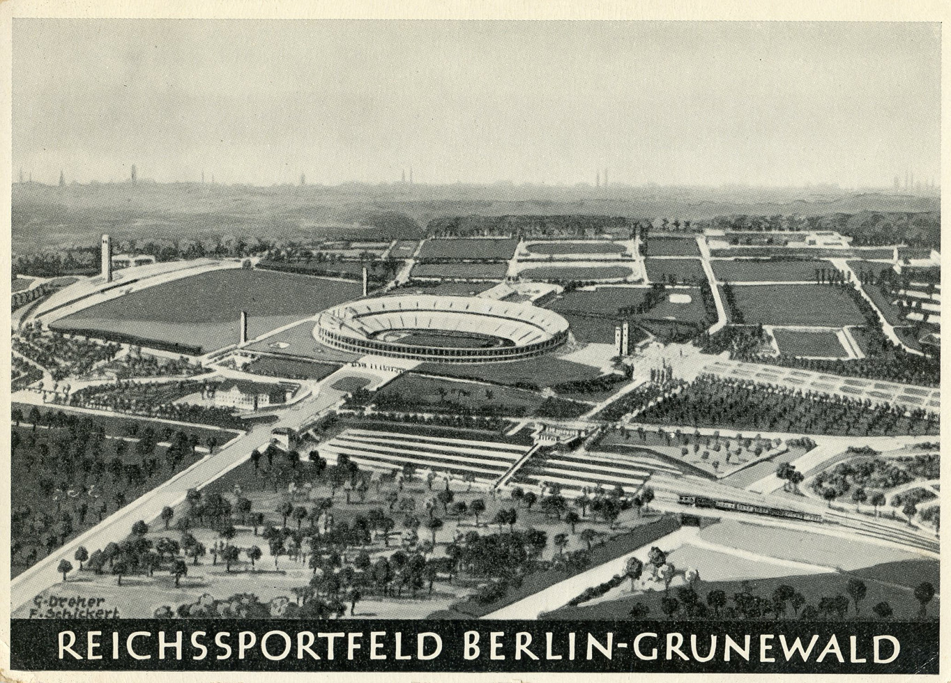 [Above: Olympic stadium with a Zeppelin overhead.]