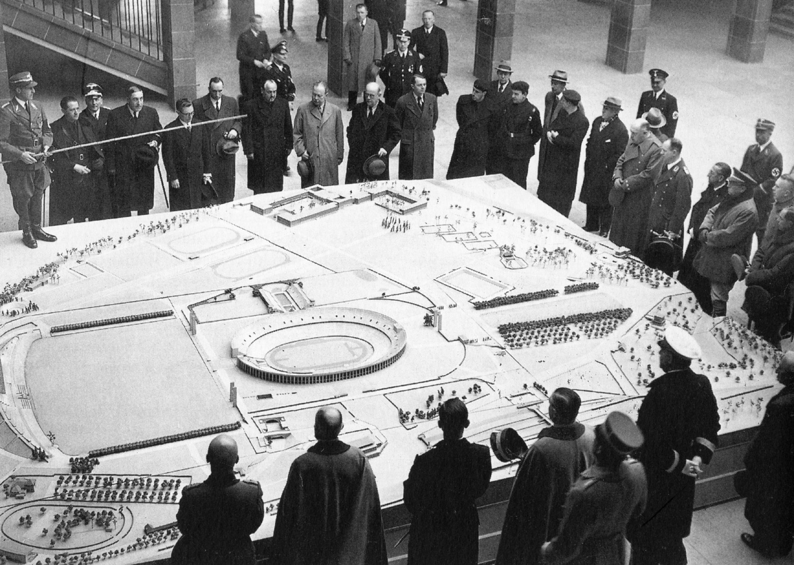 [Above: On Adolf Hitler's birthday guests gather to see the plans for the Olympic stadium.]
