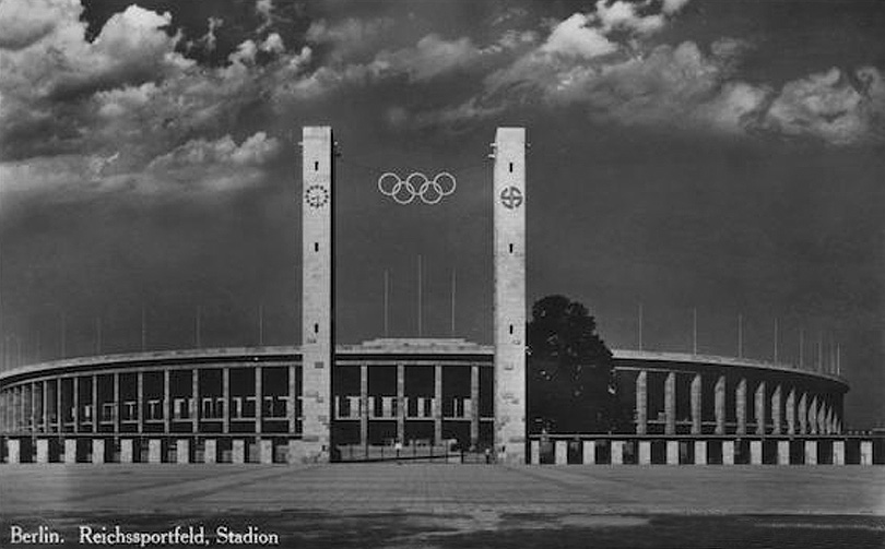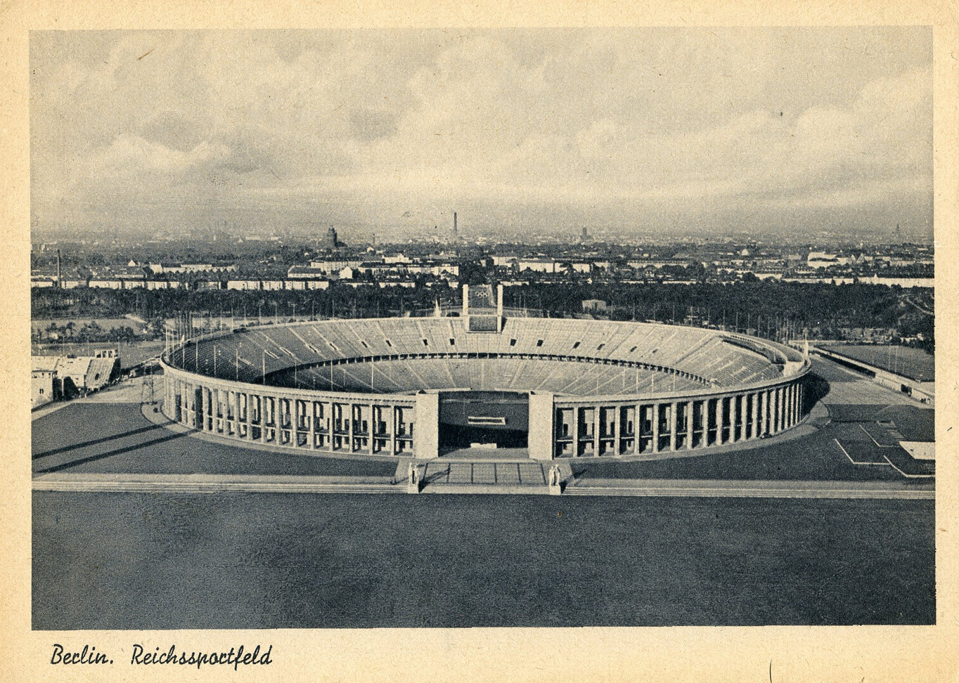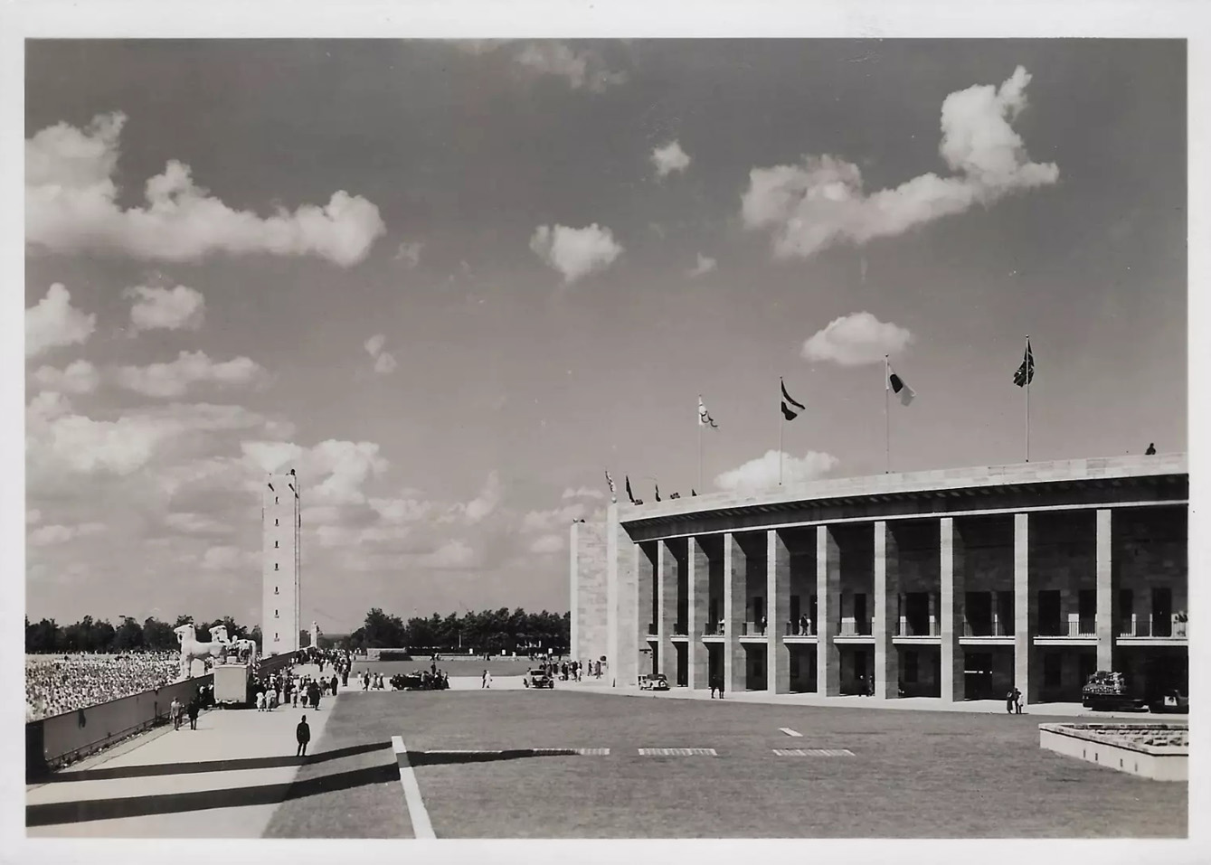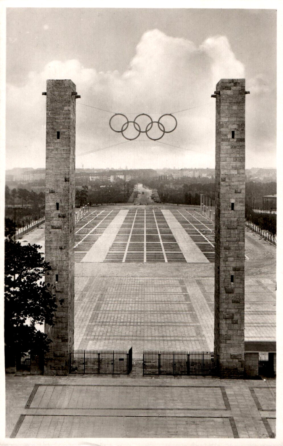 [Above: 1936 Olympic Stadium showing a statue of Nike, the Goddess of Victory at the Reichssportfeld.]
