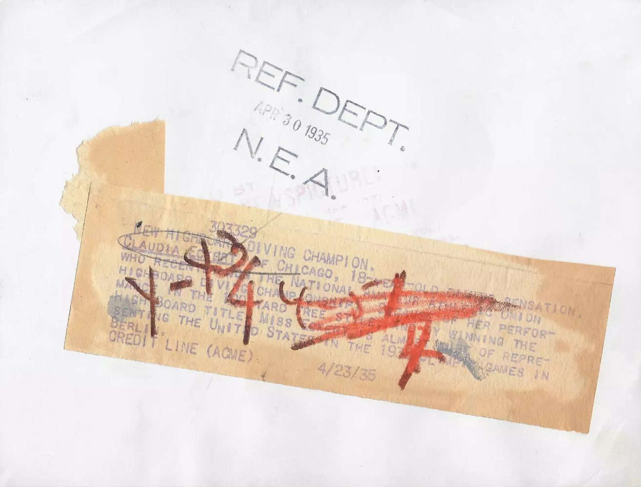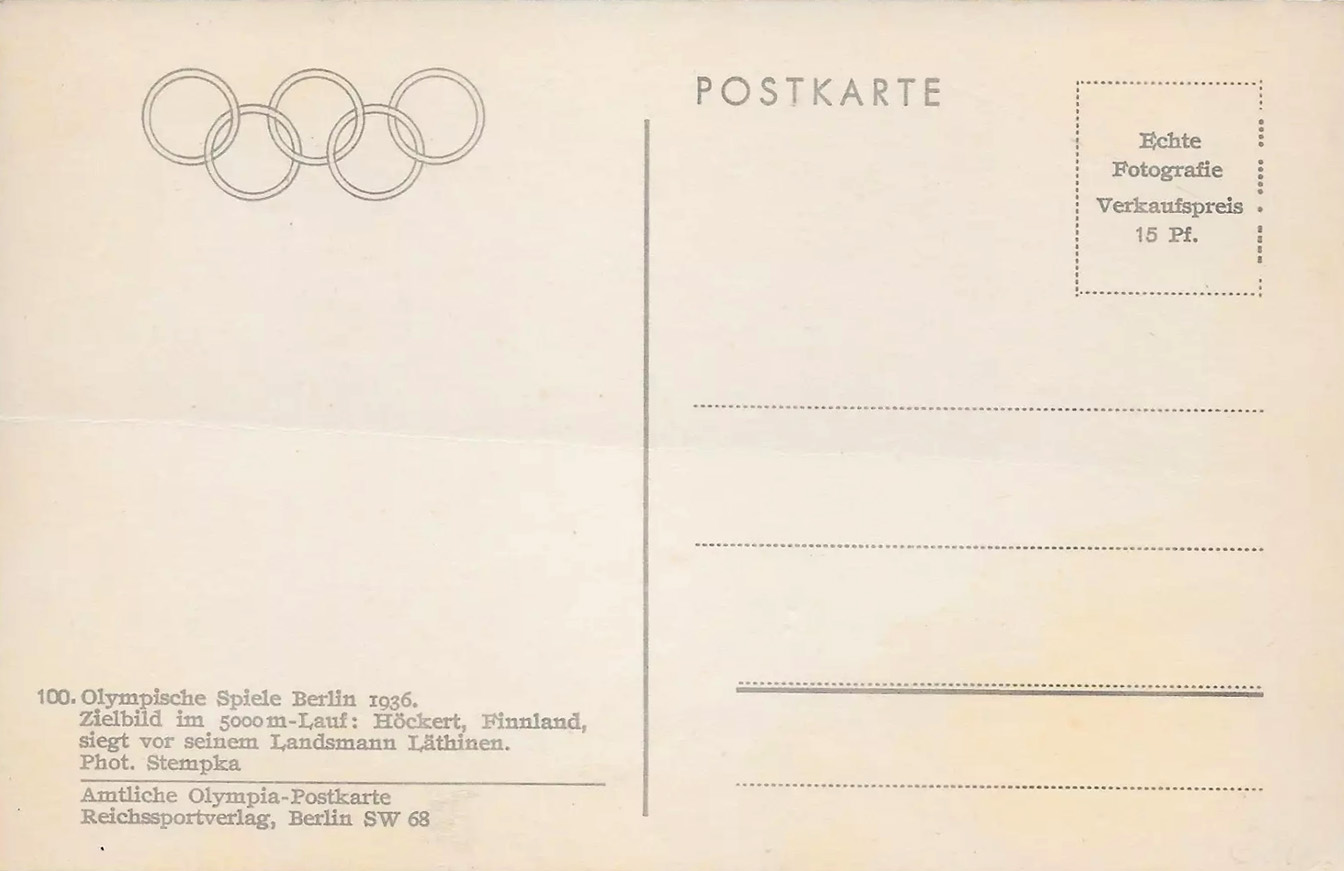 [Above: Olympics postcard - reverse. This was used by a news agency. Note that on the front of the photo an editor has outlined her features to stand out better when reproduced.]