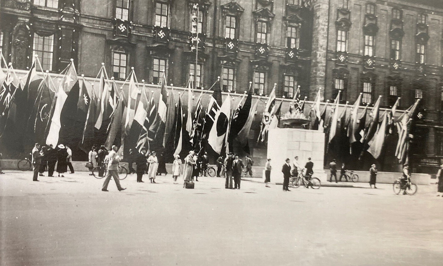 [Above: Even the Brandenburg Gate is decorated for the 1936 Olympics.]