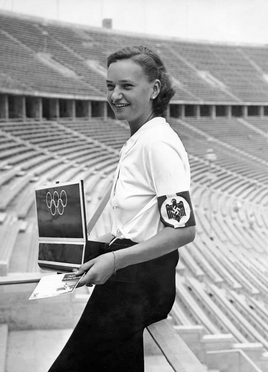 [Above: Wow, this is a cool picture. The girl here is at the 1936 Olympics selling postcards. What a neat looking armband -- this eagle design was used during the Olympics.]