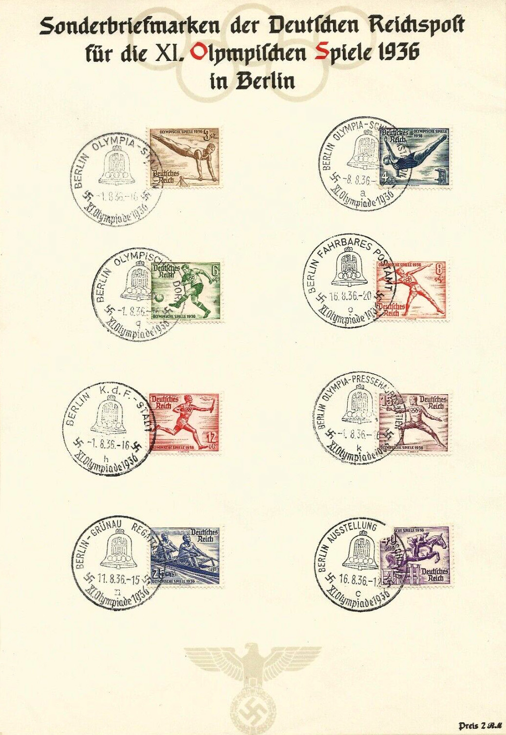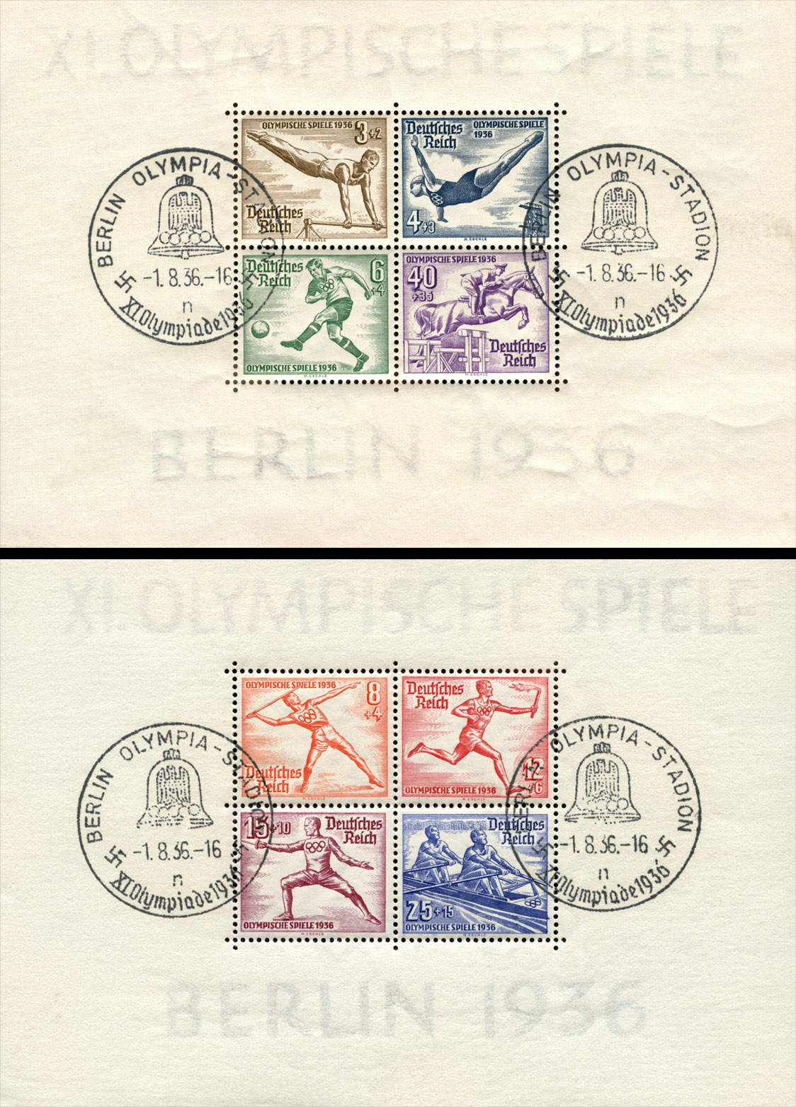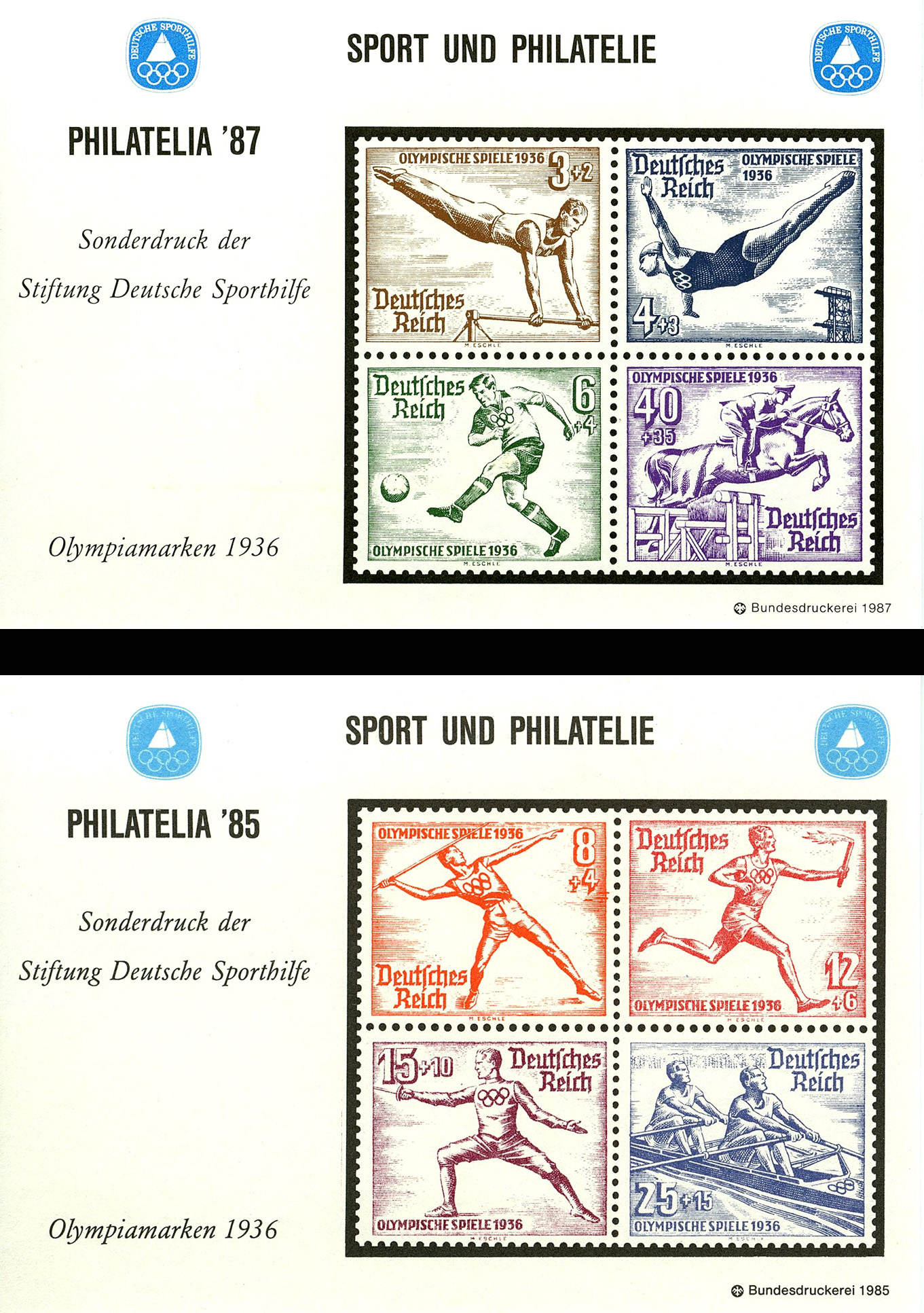 [Above: A set of German souvenir sheets from 1985 showing the 1936 Olympics stamps. It says 'Sonderdruck der Stiftung Deutsche Sporthilfe' (Special edition of the German Sports Aid Foundation).]