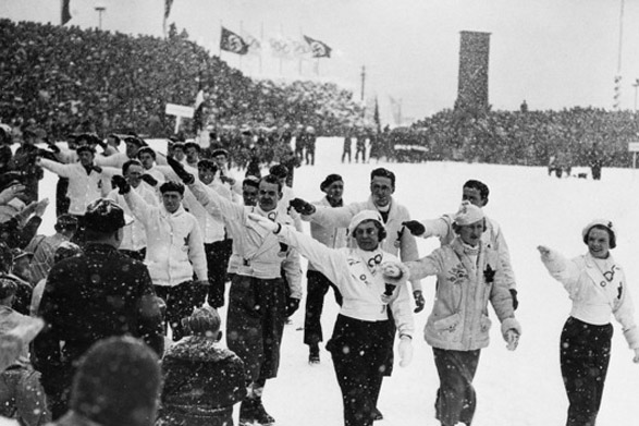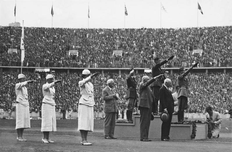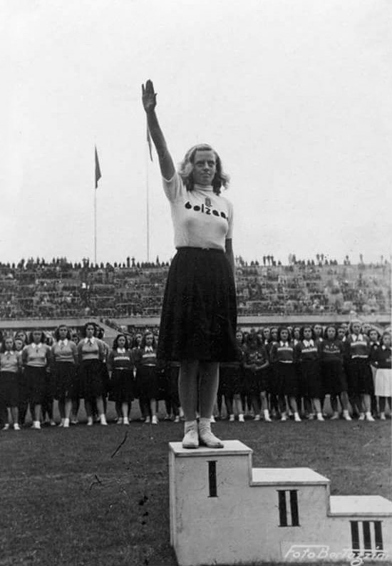 [Above: A German athlete shows his support of Adolf Hitler. Note Mein Kampf and other books on the table.]