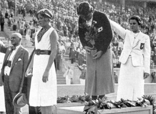 [Above: Japanese gold medal winner bows while the Japanese national anthem is played. Behind her is second place winner Martha Genenger (Germany) and third place winner Inge Sorensen.]