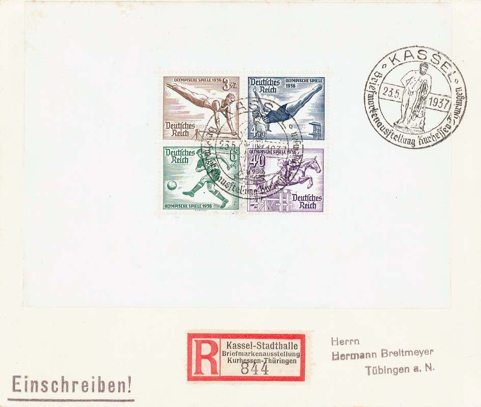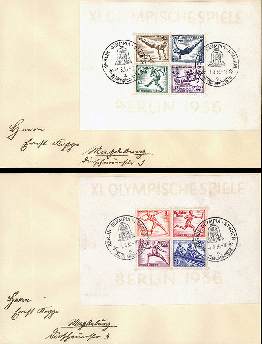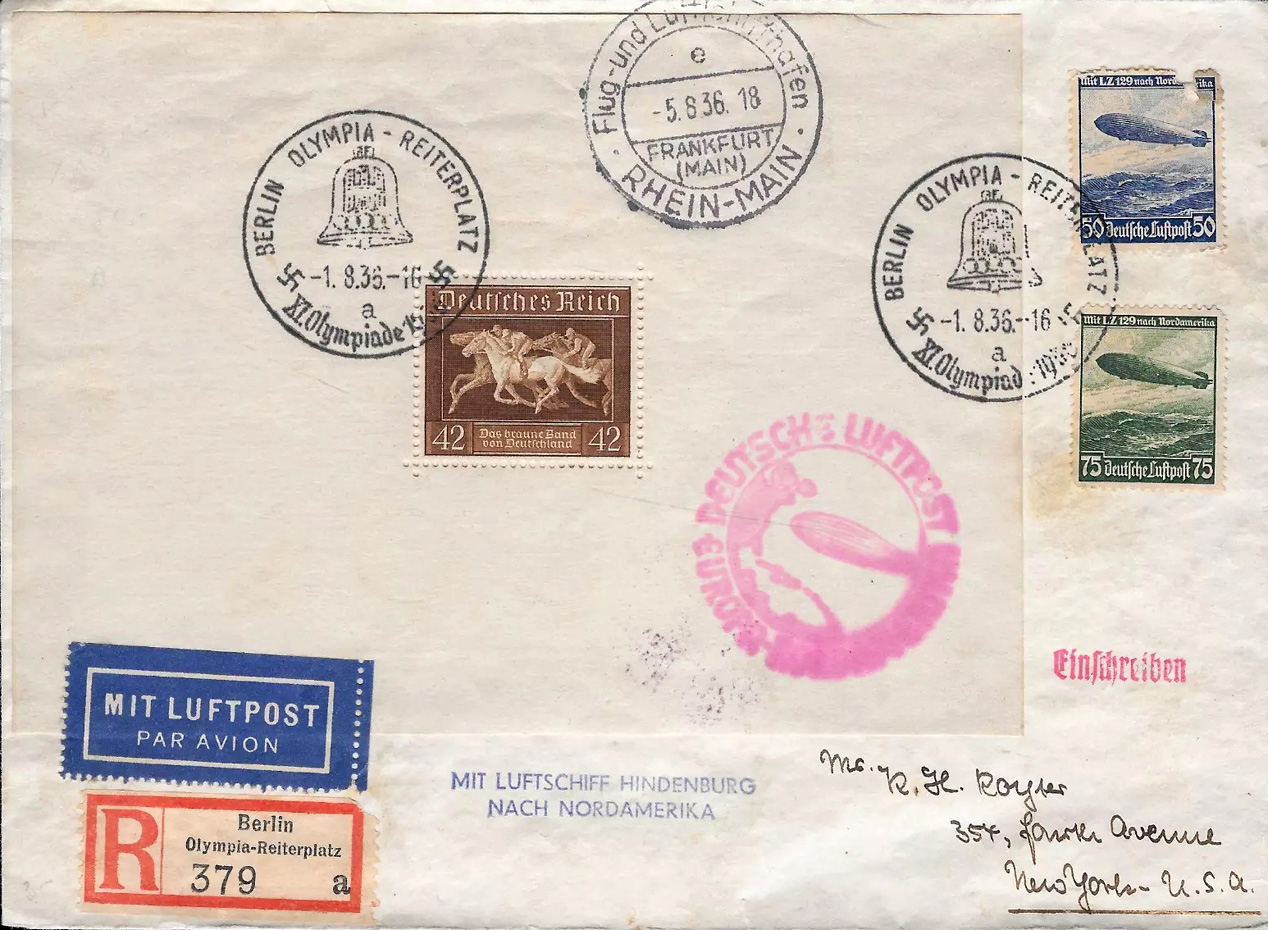 [Above: A German souvenir sheet unrelated to the Olympics, but used with Olympic cancels, including the fact that it was sent via the Hindenburg to New York.]