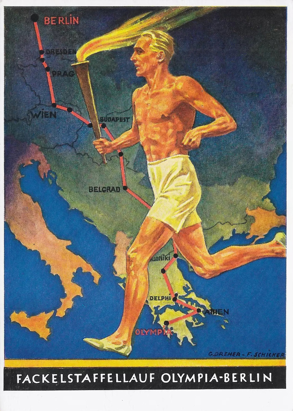[Above: Postcard showing the route the Olympic torch runners took from Greece to Berlin.]