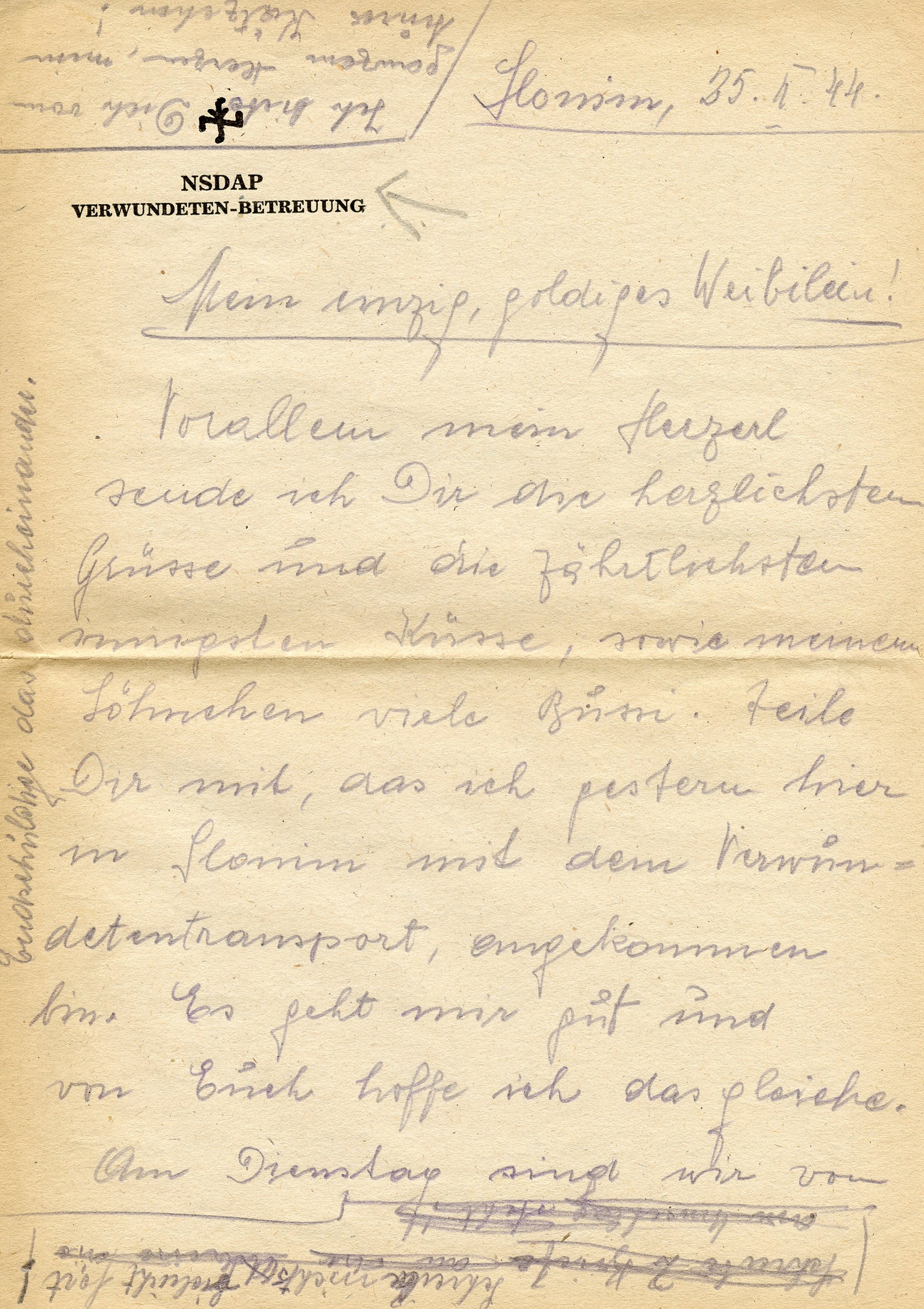 [Below: Letter page one. This says, in black, 'NSDAP - Verwundeten-Betreuung' (Care for the Wounded). The Party played a big role in helping care for wounded soldiers.]