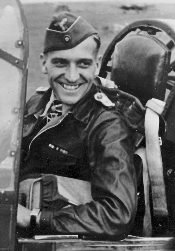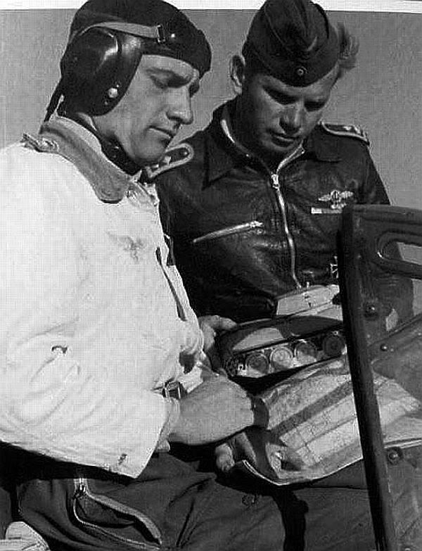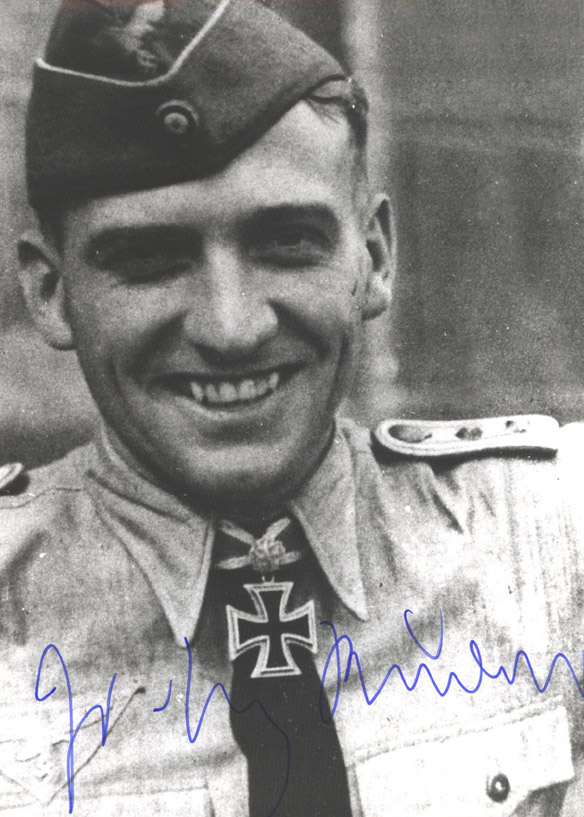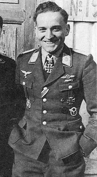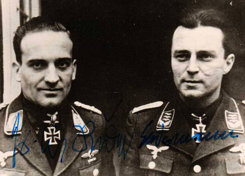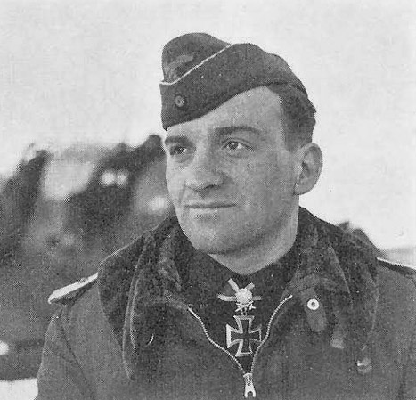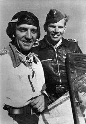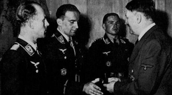 [Below: Rudel (center) receives the Swords to his Knight's Cross with Oak Leaves from Adolf Hitler. On his left is Dieter Hrabak and on his right is his gunner Erwin Hentschel.]