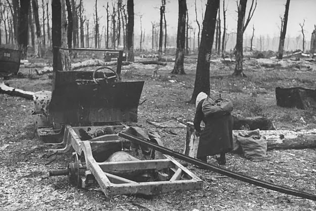 [Above: A woman gathers wood next to a vehicle that has been stripped to its skeleton. Berlin, 1945.]