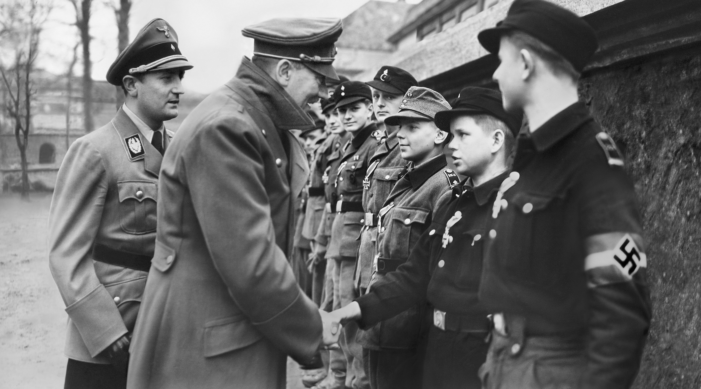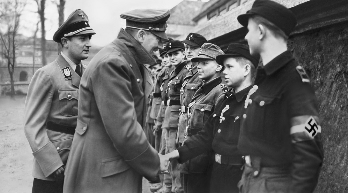 [Above: Adolf Hitler, with his brave and courageous little soldiers, in one of the last pictures of our leader. The invading Allied armies were shocked and terrified when they rolled into German territory and faced the pure devotion and utter ferocity of the children of the Reich. Click to enlarge!]