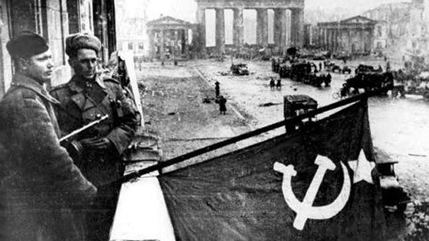 [Above: Two commie monsters raise the flag of darkness over Berlin.]