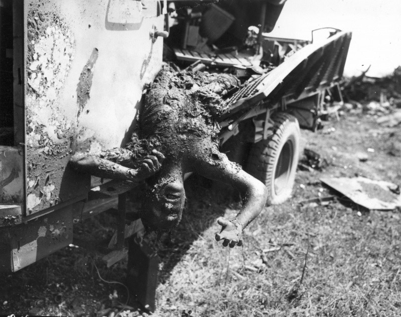 [Above: The burned remains of a German soldier who manned a gun mounted on a truck. This area was just outside of Artena (a town in the Metropolitan City of Rome), Italy. 1944.]