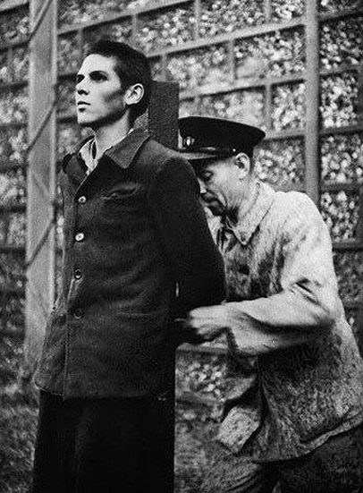 [Above: A young steely-eyed French Militiaman is tied to a stake before being murdered by terrorists armed and paid for by the American government, the so-called 'Marquis', France, 1944.]