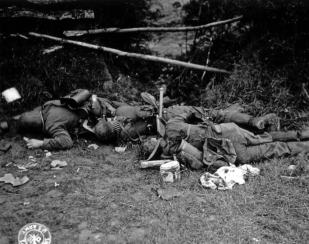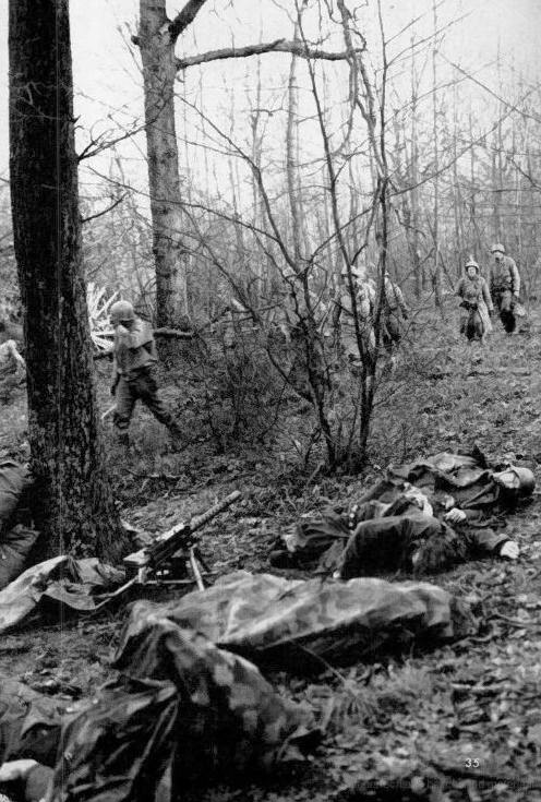 [Above: The haunted Hürtgen Forest, 1944. While this picture shows fallen German warriors, thousands and thousands of Americans were killed in this forest. It was a terrifying place for Americans, the Germans were ready for them. Many Americans refused to fight here, many were court-martialed, and some were even executed for treason rather than go back into the cursed place.]