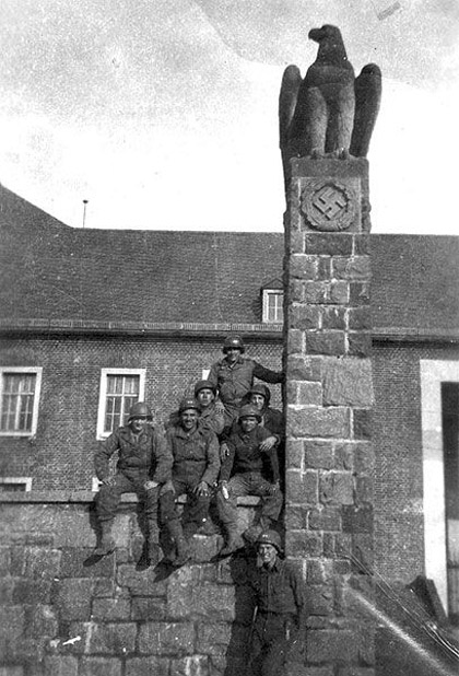 [Above: A group of brainwashed American beasts gloat beside the remains of glorious Third Reich architecture. What survived their bombs was usually dynamited or the swastikas chiseled away like that seen below.]