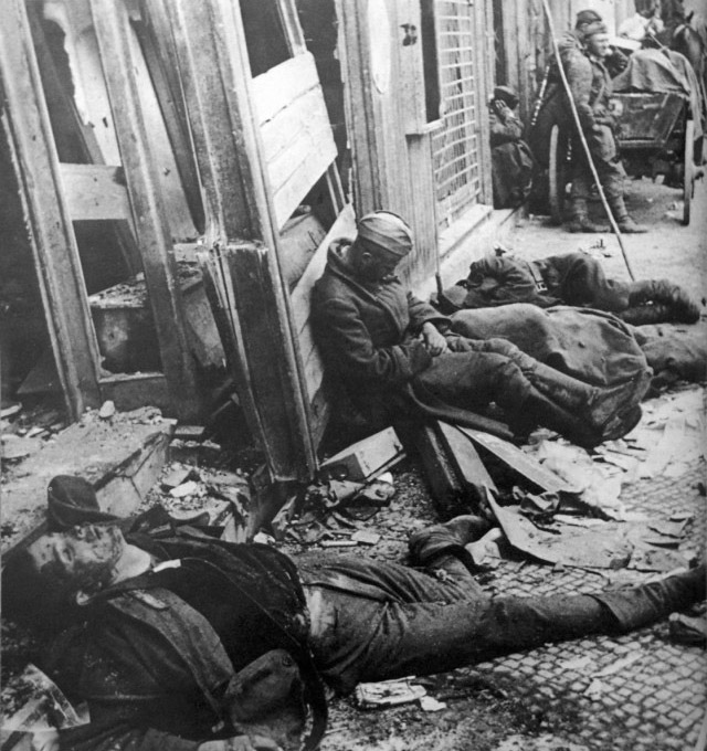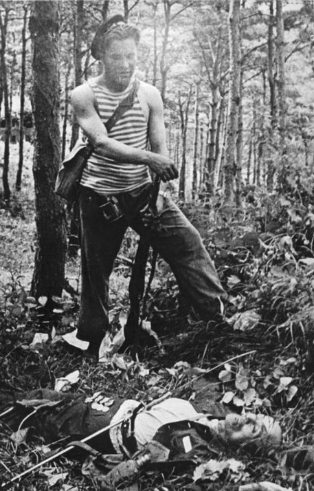 [Above: Communist soldiers taking a afternoon nap next to corpses of German soldiers. Disgusting monsters.]