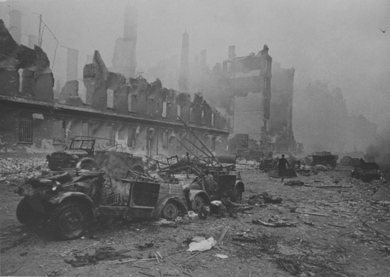 In many areas the heat from the burned-out ruins was so intense even after the fire storm itself had subsided that it was days before the streets could be entered at all. In the conflagration areas it was thirty hours after the attack before it became possible to see a little in the artificial twilight; up to then dense clouds of black smoke mixed with dust had blotted out the otherwise cloudless sky.'