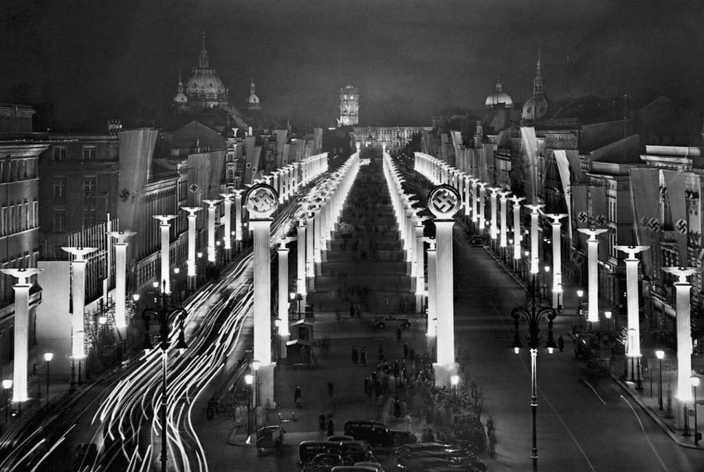 [Above: Berlin, a magical place, glowing in the night. A jewel of National Socialism. Of sanity, order, justice and peace. The cowardly Allied bombs reduced it to ash. The Allies were the destroyers of everything beautiful. They spread their own ugliness in everything they touched.]