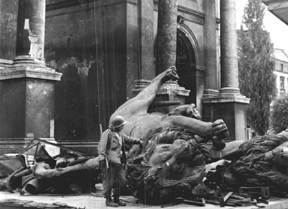 [Above: Munich, after Allied terror raids. Here we see a lovely little American lamb examining a fallen German lion. His cowardly bombs destroyed priceless items of European culture and art older than anything in the United States.]