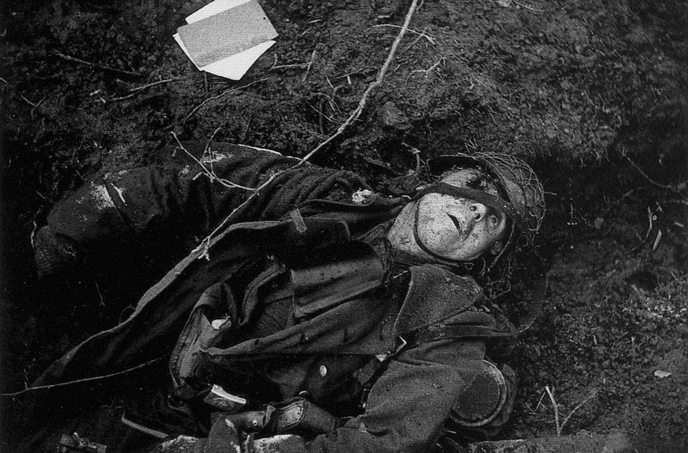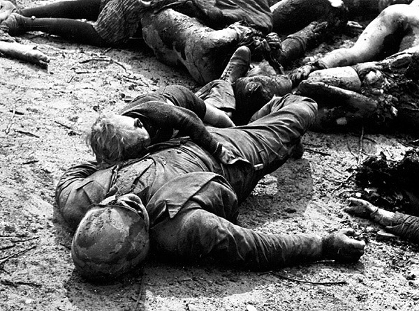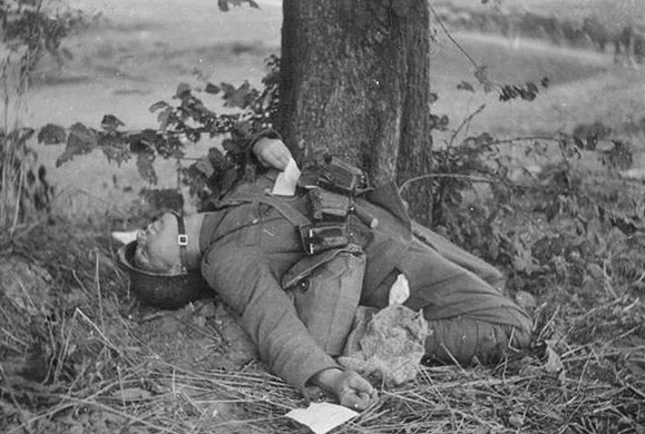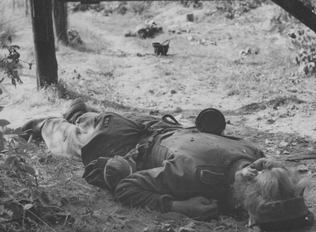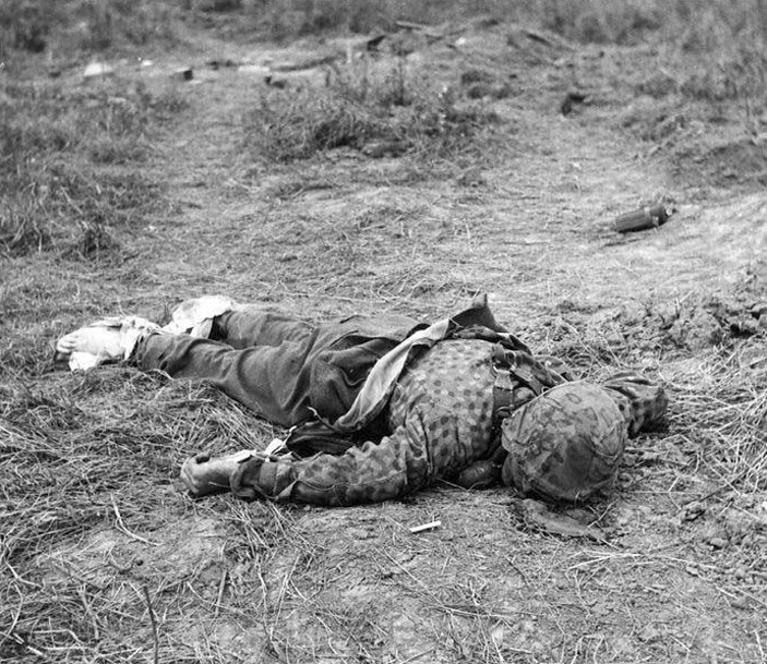 [Above: Another hero finds his blessed end. Notice how you never see pictures of dead American or United Kingdom soldiers? Yet endless dead Germans. That's because dead Allied troops turned into butterflies after they died. Yes, that must be it.]