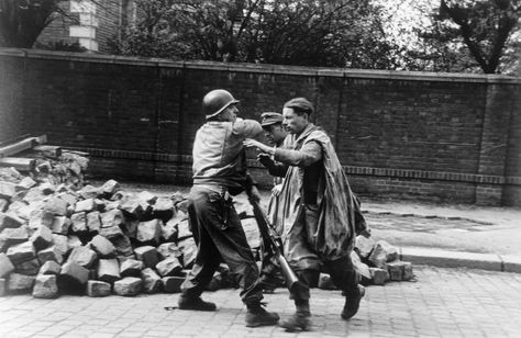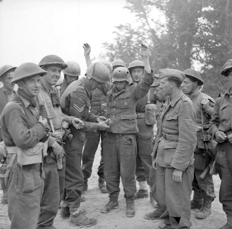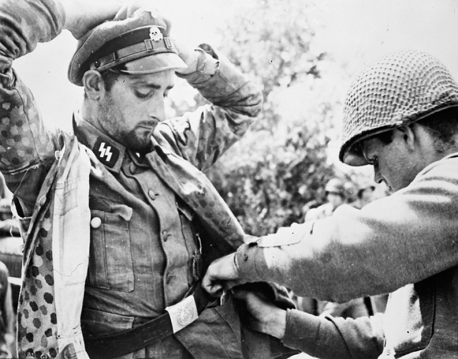 [Above: A Waffen-SS officer with his hands up as an Allied thief searches him for 'souvenirs'. I saw an interview once of a German Wehrmacht veteran who said to look carefully at groups of Allied and German prisoners. You'll see the difference is that German prisoners were ordered to hold their hands up for hours on end, while Allied prisoner were not. He said it was torturous to do this. And if the Germans put their arms down they were often shot. Their arms would ache terribly and turn numb.]