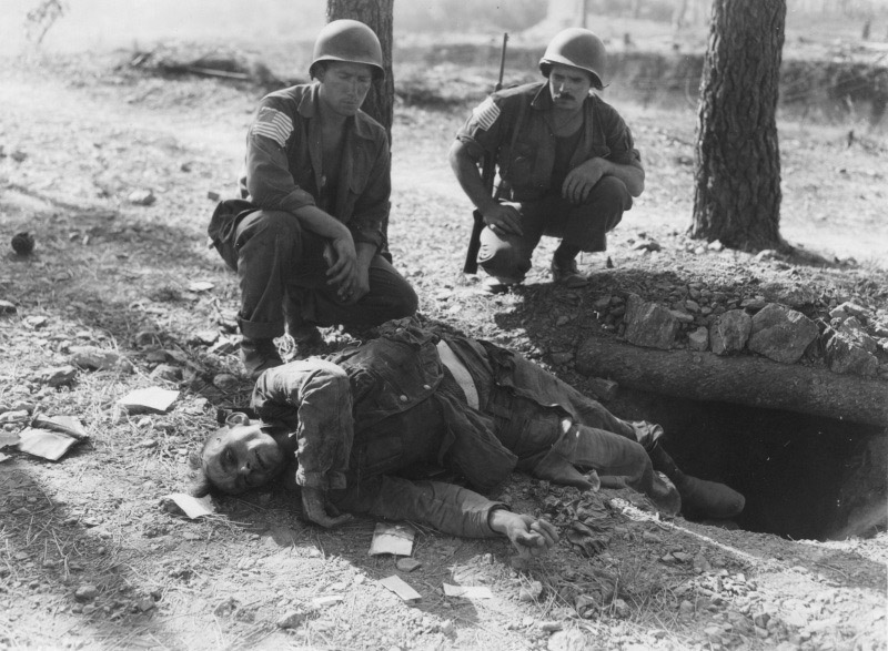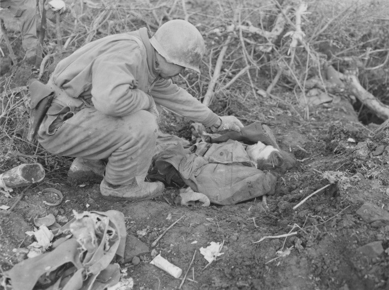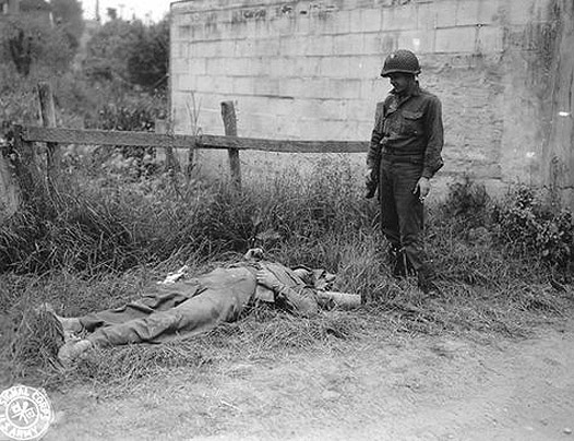 [Above: An American soldier looks down with a smirk on a dead German.]