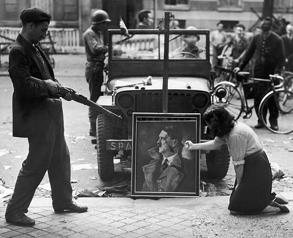 [Above: A big, bad commie holds his gun to a painting of Adolf Hitler. Whoa scary. A woman has fallen on her knees to worship the defeat of her country and the death of all things decent and good. In sixty years she probably wouldn't believe what her country had become. We could show her pictures of the future and maybe she'd say 'Why are you showing me pictures of Africa?'. That's not Africa, Madame, that's Paris, we'd tell her. Au revoir.]