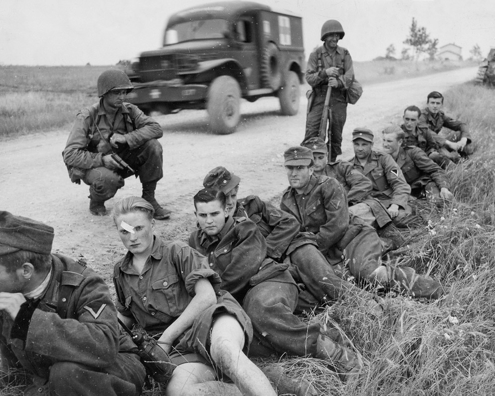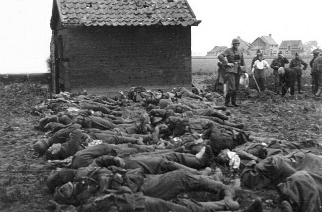 [Above: U.S. Army photo of German martyrs who gave their lives defending Europe after being murdered by the invading American war machine. Were these men killed like so many others after their surrender? Where are their weapons? This crime scene was near Saint Fromond, Normandy, France, June 1944.]
