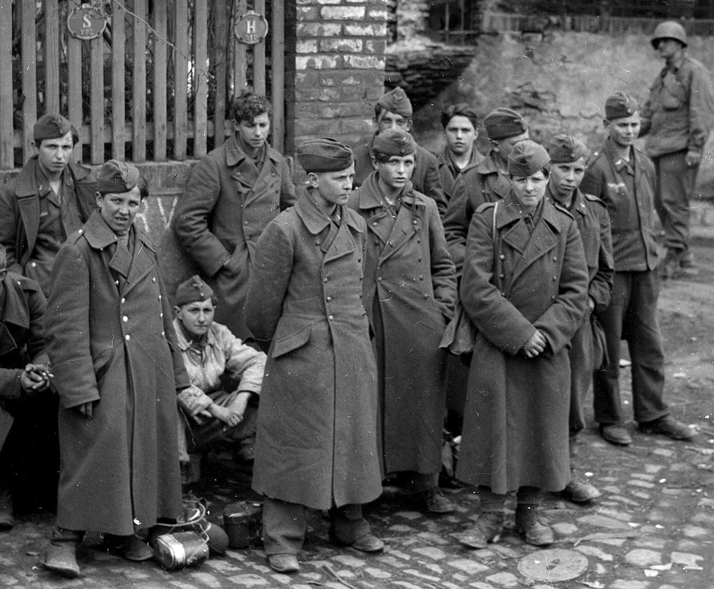 [Above: Mere boys, recruited as Flakhelfers in a desperate attempt to stop the fire raining down from the skies, are now P.O.W.s. of the most vengeful victors the world had ever seen. Click to enlarge.]