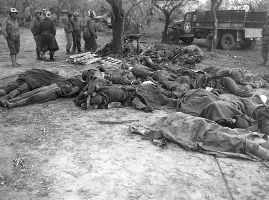 [Above: German dead in Italy, knowing the Allies, they were probably machine gunned down. In the background American Red Cross soldiers look on.]