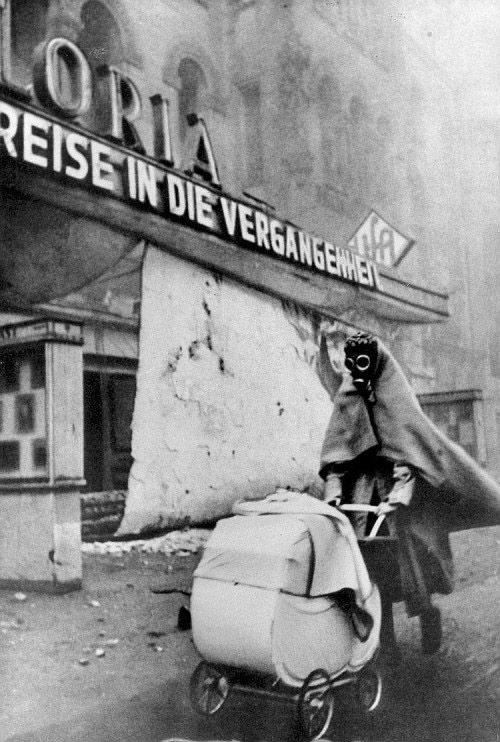 [Above: A gasmasked German mother retreats through the bombed-out streets with her baby, a child who will grow up in a world of brainwashing and instilled guilt of the likes the world had never seen before, which continues to this day, and will forever unless the world occupation ends.]