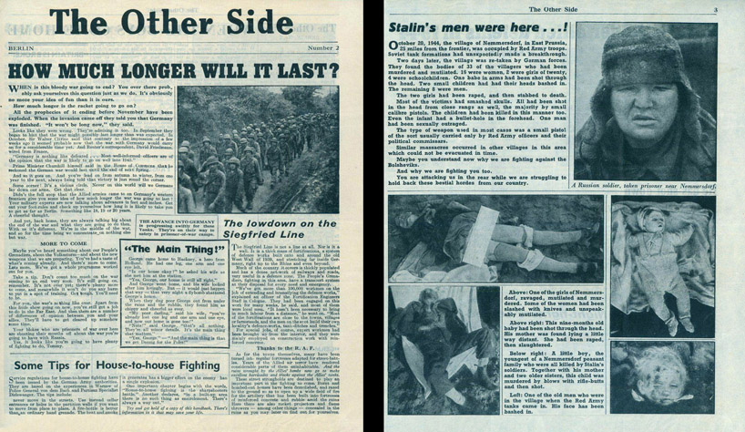 [Above: 1944 German leaflet dropped on Allied soldiers on the Western Front from a V1 rocket. The Nemmersdorf Massacre was something from a nightmare. I implore you to look into it. It was truly the depths of evil. Click to enlarge.]