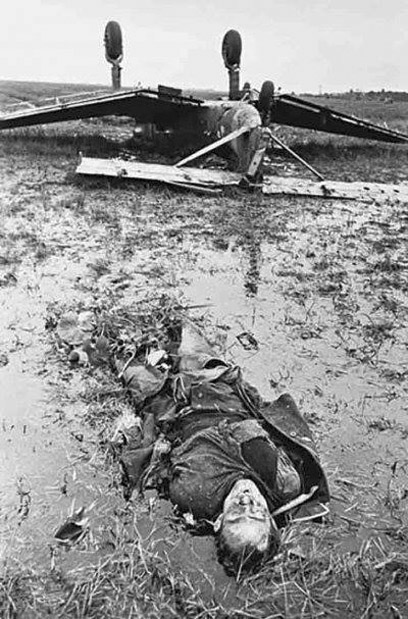 [Above: An angel fallen from the sky. This picture shows a German pilot dead outside his downed Junkers Ju 87, Leningrad, 1943.]