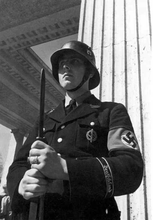 [Above: A valiant knight from the Panzergrenadier-Division 'Großdeutschland'. He is standing as an honor guard in front of the Feldherrnhalle. This magnificent building served as a monument commemorating the death of the 16 martyrs of National Socialism who died during the Beer Hall Putsch.]