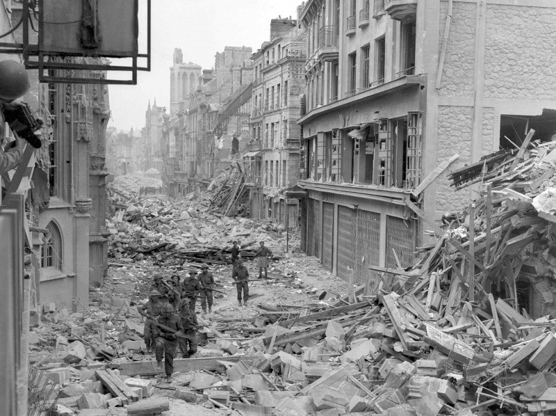 [Above: Canadian soldiers patrol the streets of the ruined French town of Saint-Pierre. The Allies unleashed thousands of bombs and exploding shells on French civilians prior to the invasion.]