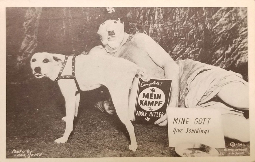 [Above: Here is an example of Allied propaganda. It was extremely primitive and childish, vile and offensive. Here we see a dog pissing on Mein Kampf and 'Hitler' begging for change. Click on the picture if you dare see other idiotic photos in this series.]