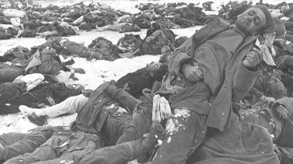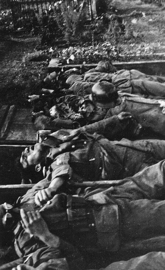[Above: Lines of fallen comrades after a battle on the Eastern Front.]